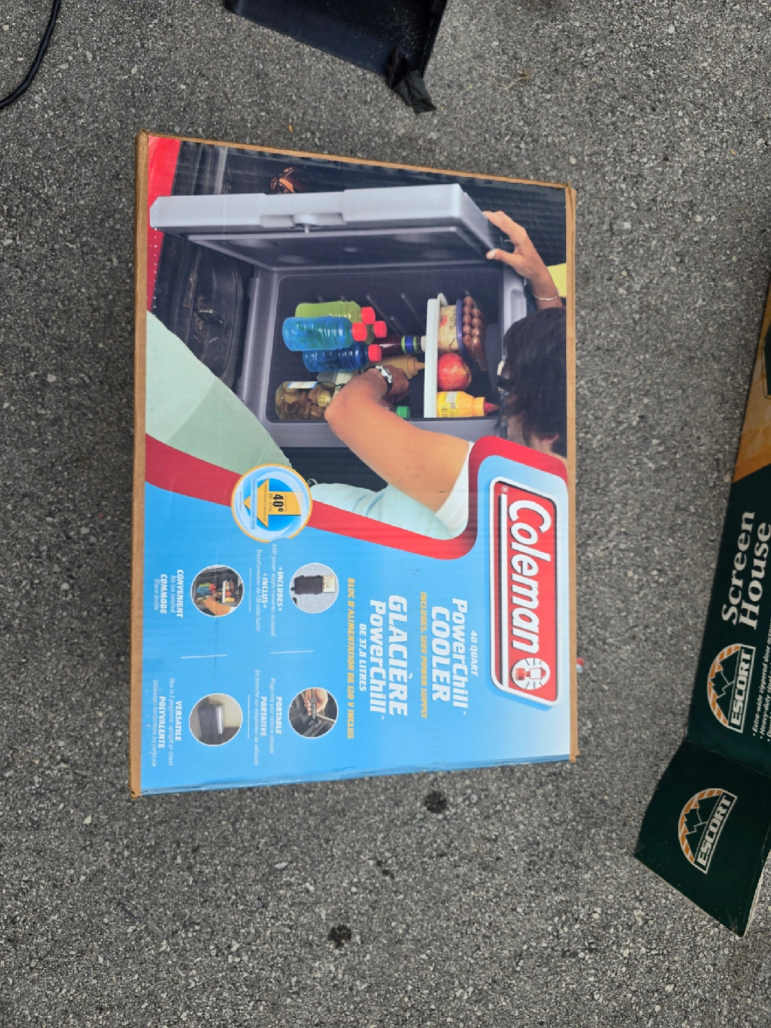 10Selling a Coleman 40-Quart PowerChill Cooler! It's in like-new condition and comes with the box. This cooler has a capacity of 37.8 litres, perfect for keeping your drinks and snacks cool on the go. Includes the charger!