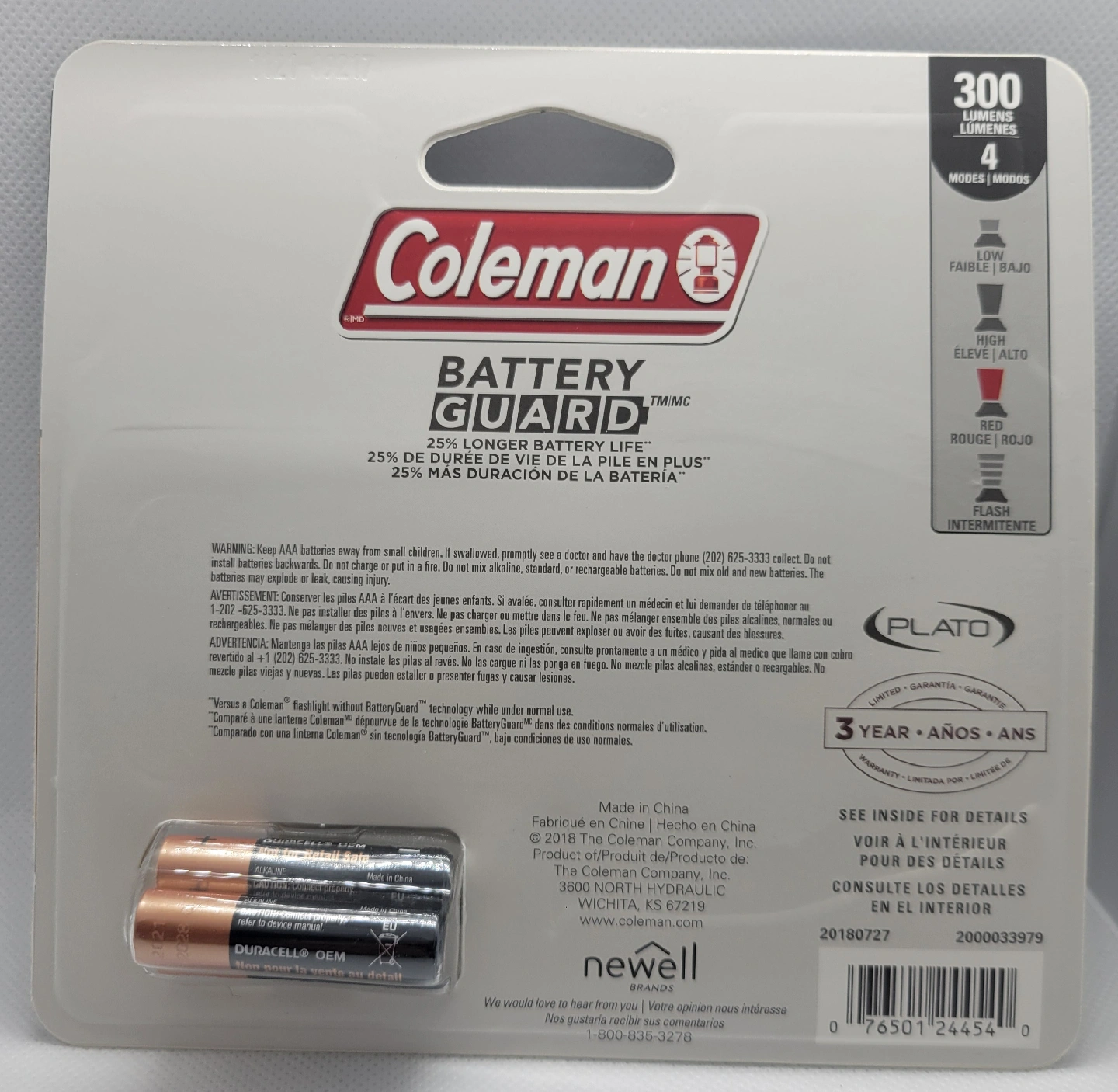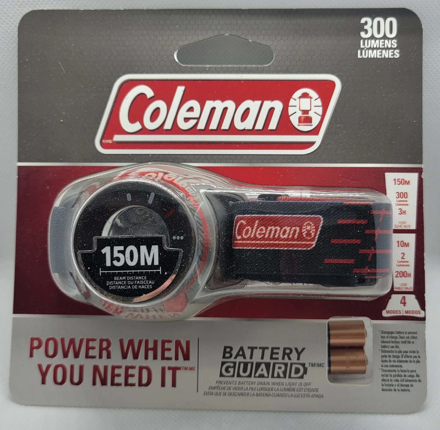 New in original packaging Coleman 200 lumens. 150 meter beam distance Battery guard 25% longer Battery life 3 aaa duracell batteries included