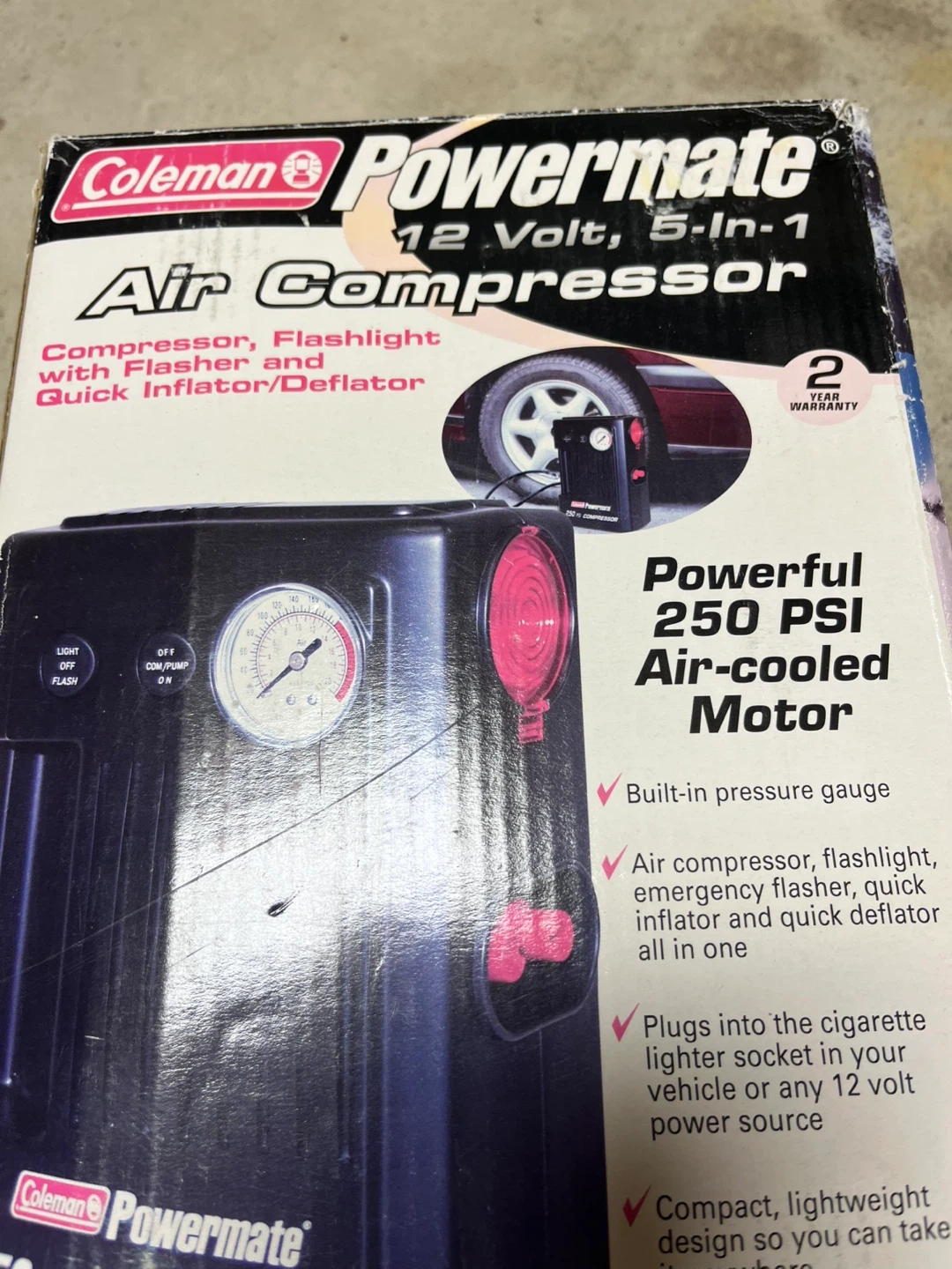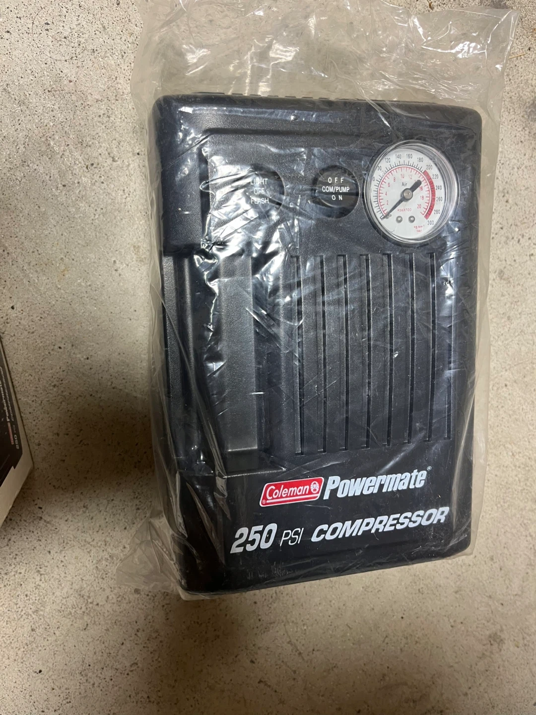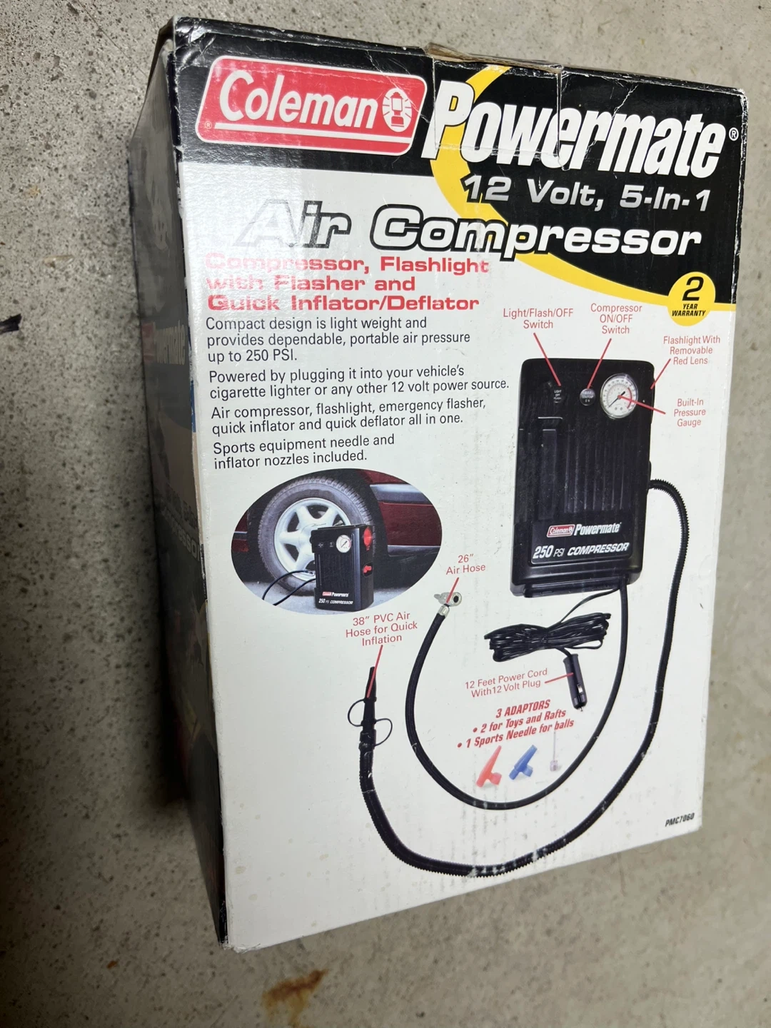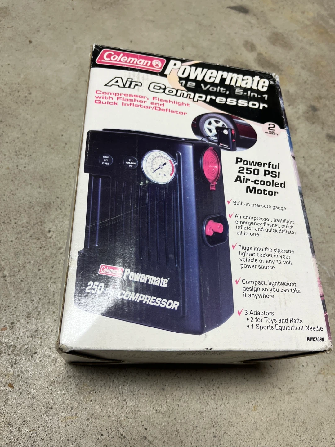 Selling a Coleman Powermate 12 Volt, 5-in-1 Air Compressor. It features a compressor, flashlight with flasher, and quick inflator/deflator. It has a powerful 250 PSI air-cooled motor and a built-in pressure gauge. It also includes 3 adaptors: 2 for toys and rafts, and 1 sports equipment needle. Compact, lightweight design so you can take it anywhere
