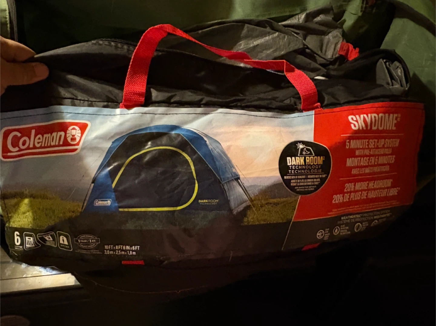 Selling a Coleman Skydome 6-person tent! It features a 5-minute setup system and dark room technology. It also has 20% more headroom than previous models. The tent measures 10 ft x 8 ft x 6 ft. Also comes with add a room for extra storage. Comes in a rolling bag to make it easy to transport