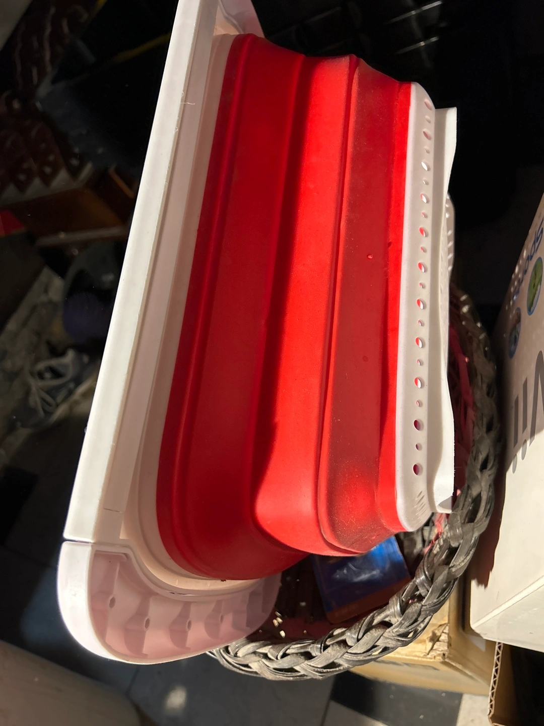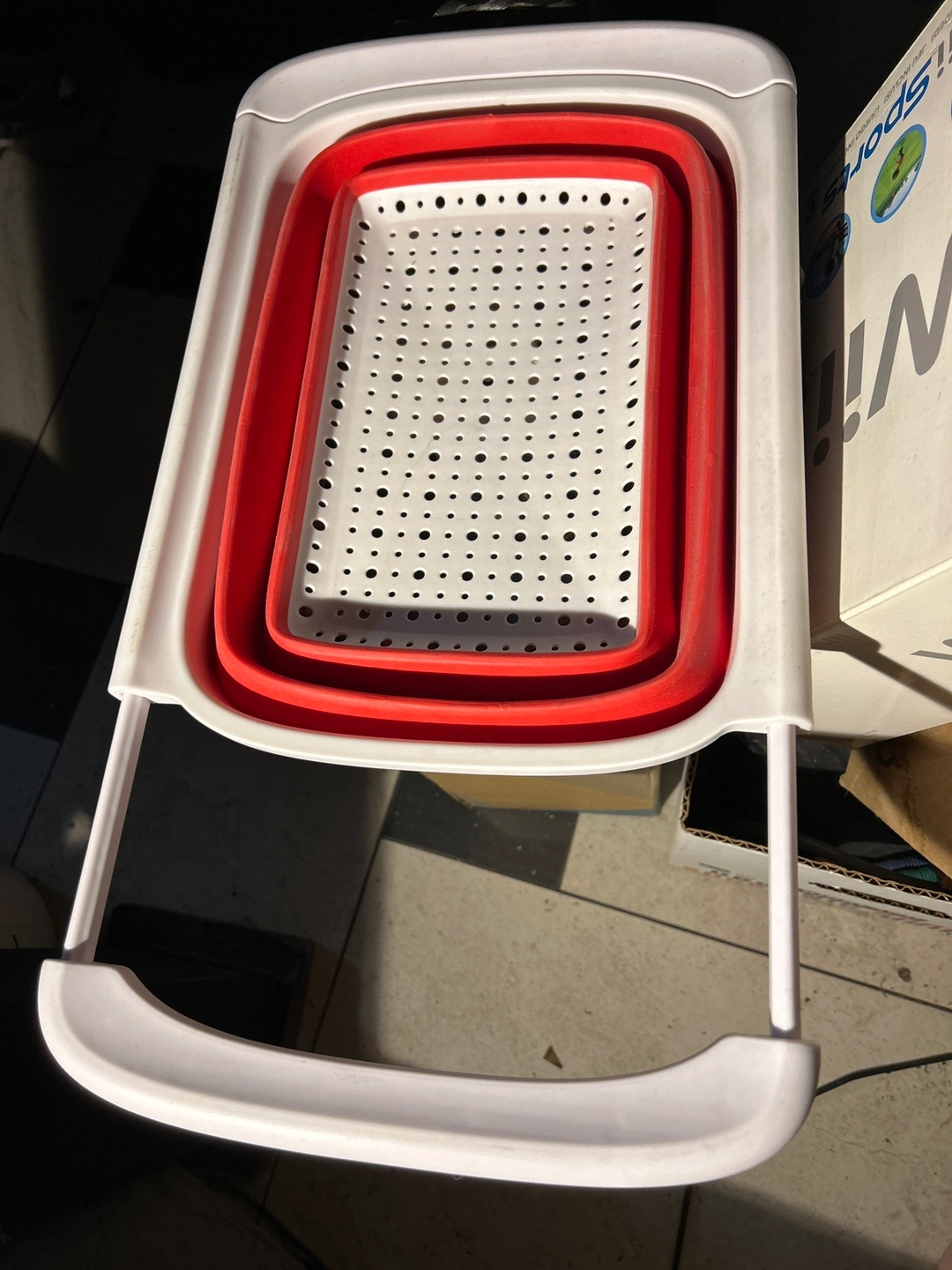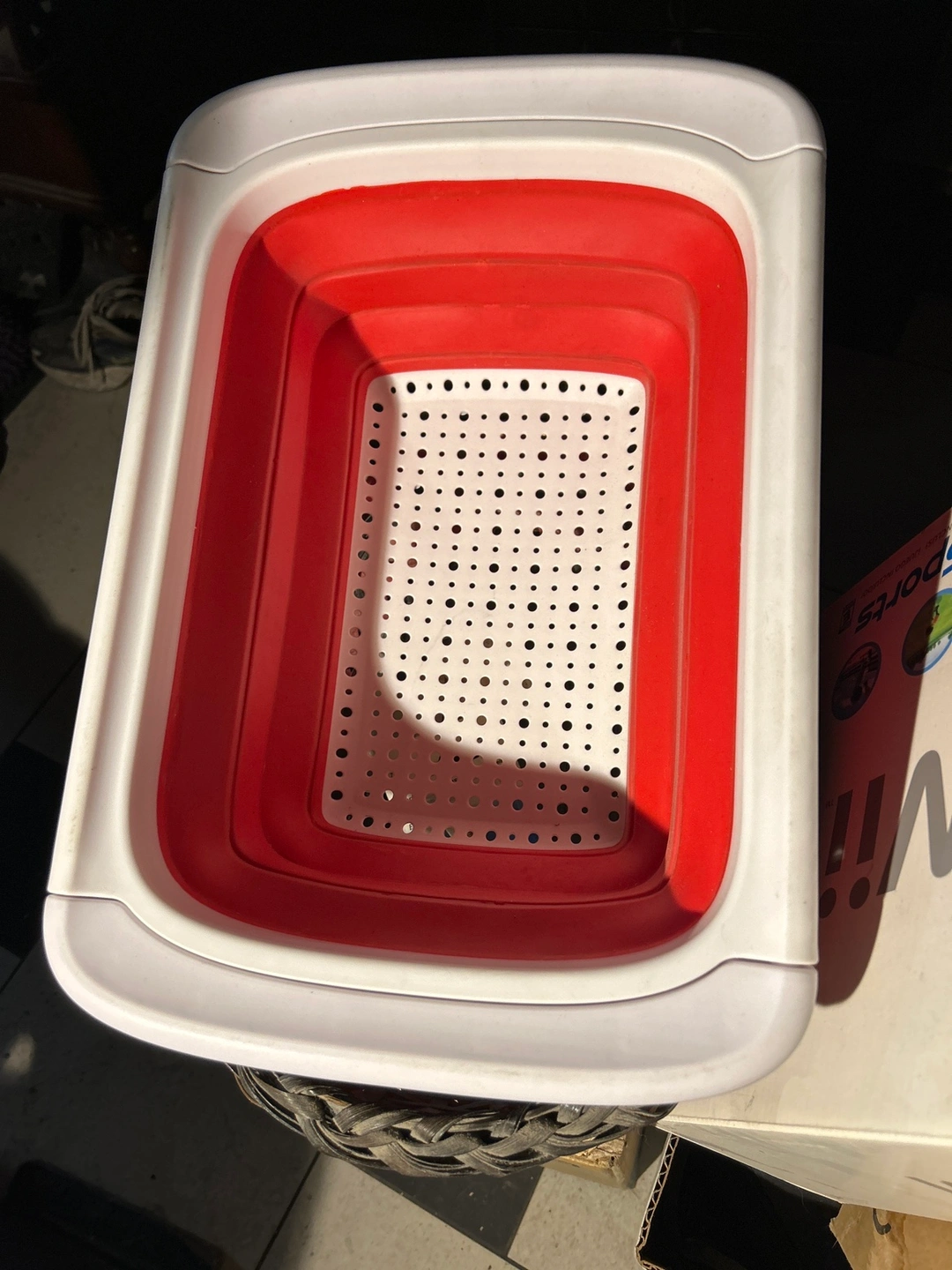 Red and white collapsible dish drainer with extendable handles. Great for rinsing and draining vegetables. It folds up for easy storage. Moving sale. See my other items.
