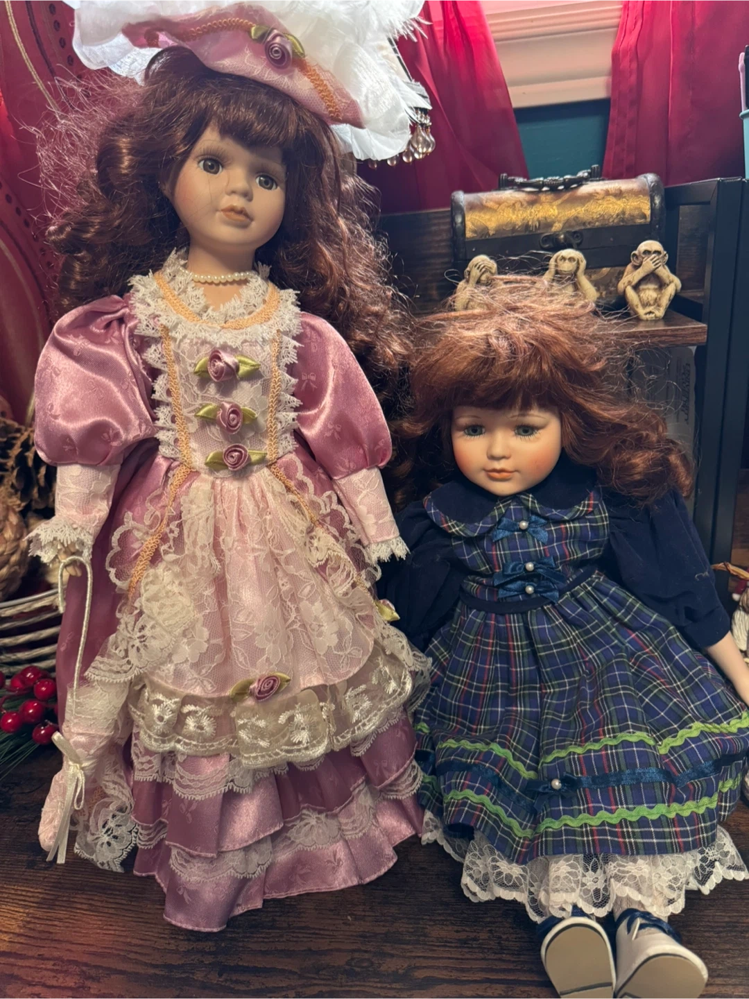 170Two beautiful porcelain dolls with intricate dresses and detailed features! They would make a great addition to any collection or a lovely decorative piece for your home.