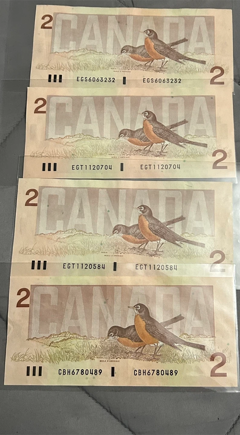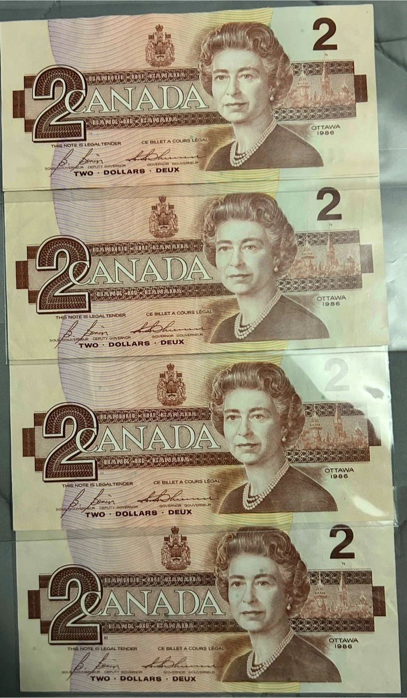 Show allCollection of 4 Canadian 2 Dollar Bills, 1986