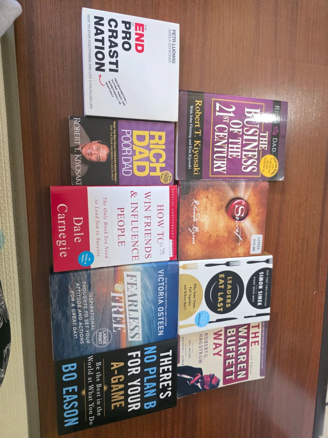 88Selling a collection of books, including titles like: each book $10 . - The End of Procrastination Nation by Petr Ludwig and Adela Schicker - Rich Dad Poor Dad by Robert T. Kiyosaki - The Business of the 21st Century by Robert T. Kiyosaki - How to Win Friends & Influence People by Dale Carnegie - Fearless & Free by Victoria Osteen - Leaders Eat Last by Simon Sinek - The Warren Buffett Way by Robert G. Hagstrom - There's No Plan B for Your A-Game by Bo Eason - The Secret by Rhonda Byrne