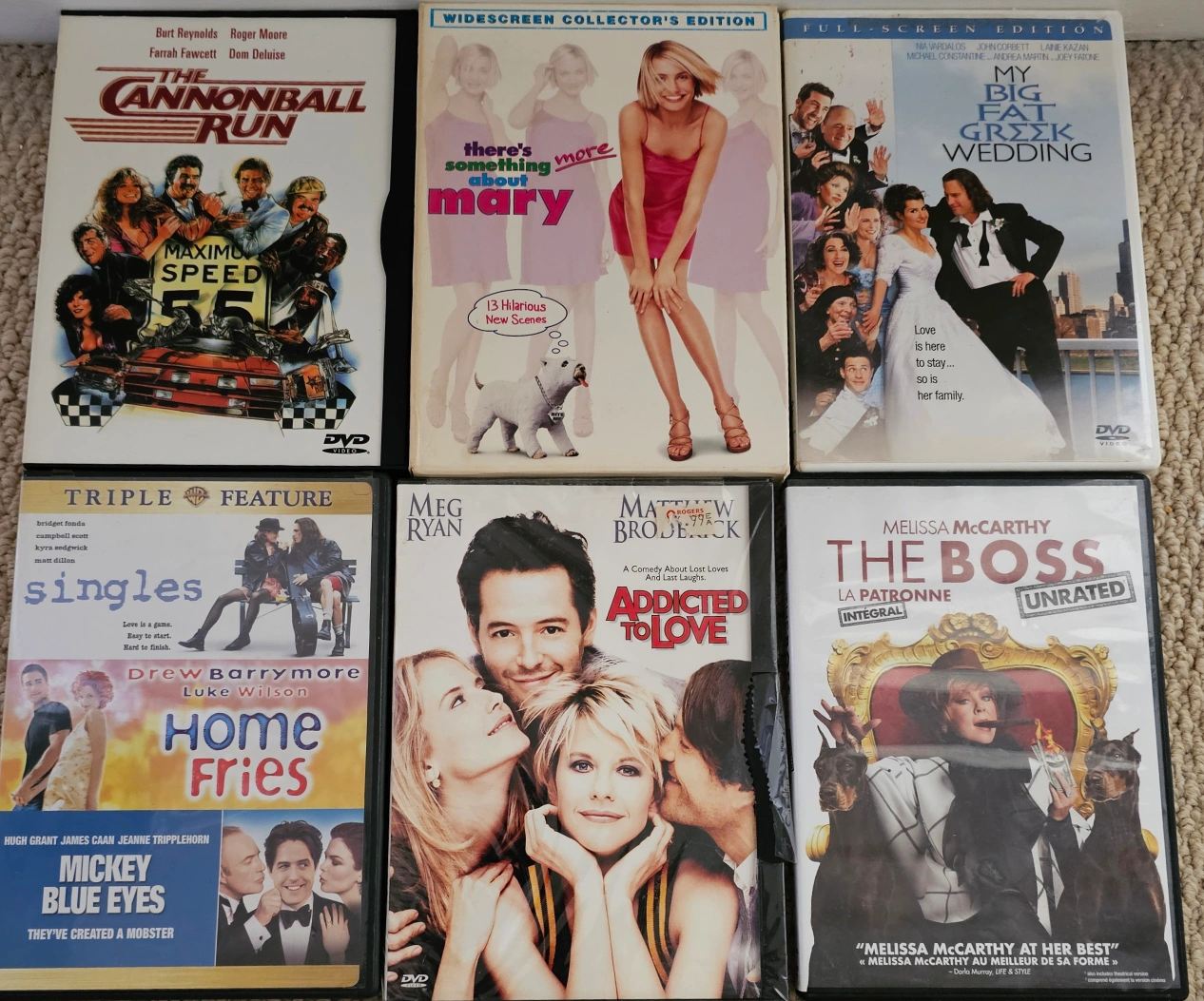 There's a collection of movies here, perfect for a cozy night in. There are titles like 'The Cannonball Run', 'There's Something About Mary', and 'My Big Fat Greek Wedding'. You will also find 'Singles' and 'Home Fries', among others. This would be ideal to watch on a relaxing day.