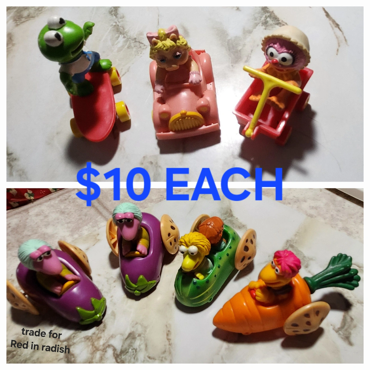 201984 vintage Cabbage Patch Kids PVC Preemie Vintage Fraggle Rock Happy Meal toys released in 1988. Mokey in eggplant Wembley & Boober in cucumber Gobo in carrot 1987 vintage Muppet Babies McDonald's Happy Meal toys Gonzo in red wagon Miss Piggy in pink car Kermit on skateboard Pickup only.