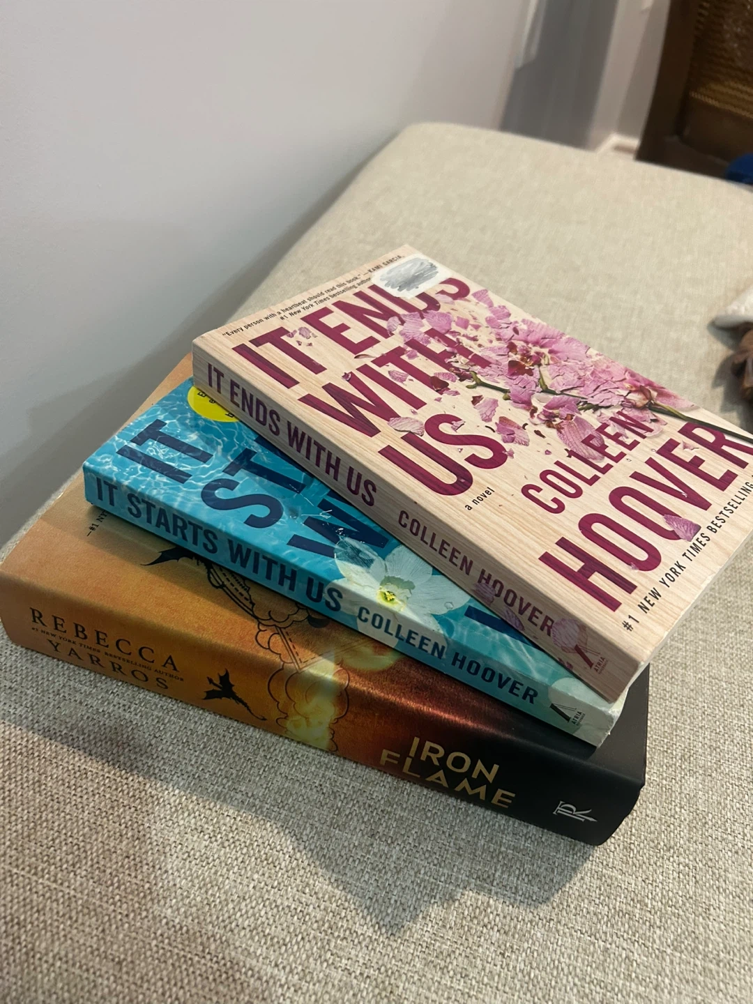 10Selling a set of three books: - It Ends With Us by Colleen Hoover - It Starts With Us by Colleen Hoover - Iron Flame by Rebecca Yarros