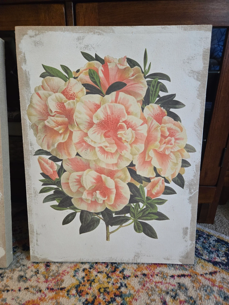 18Selling a beautiful Collezione Fresco canvas art piece featuring a floral design. The art is applied by hand over a natural jute canvas, leaving areas of the canvas exposed. The plaster finished material is stretched over a solid wooden frame. The embossed image only adheres to the plaster, giving the antique look and making every presentation unique