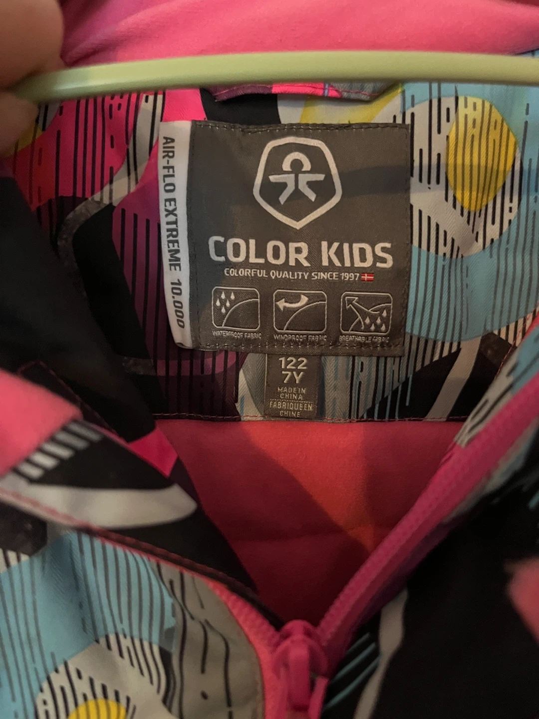 65Keep your little one warm and stylish with this Color Kids winter jacket! It features a vibrant and colourful design. The jacket is size 122, which is approximately equivalent to a 6-year-old's size. It's designed with waterproof and windproof fabric, ensuring your child stays dry and comfortable in various weather conditions. The jacket also has breathable fabric for added comfort