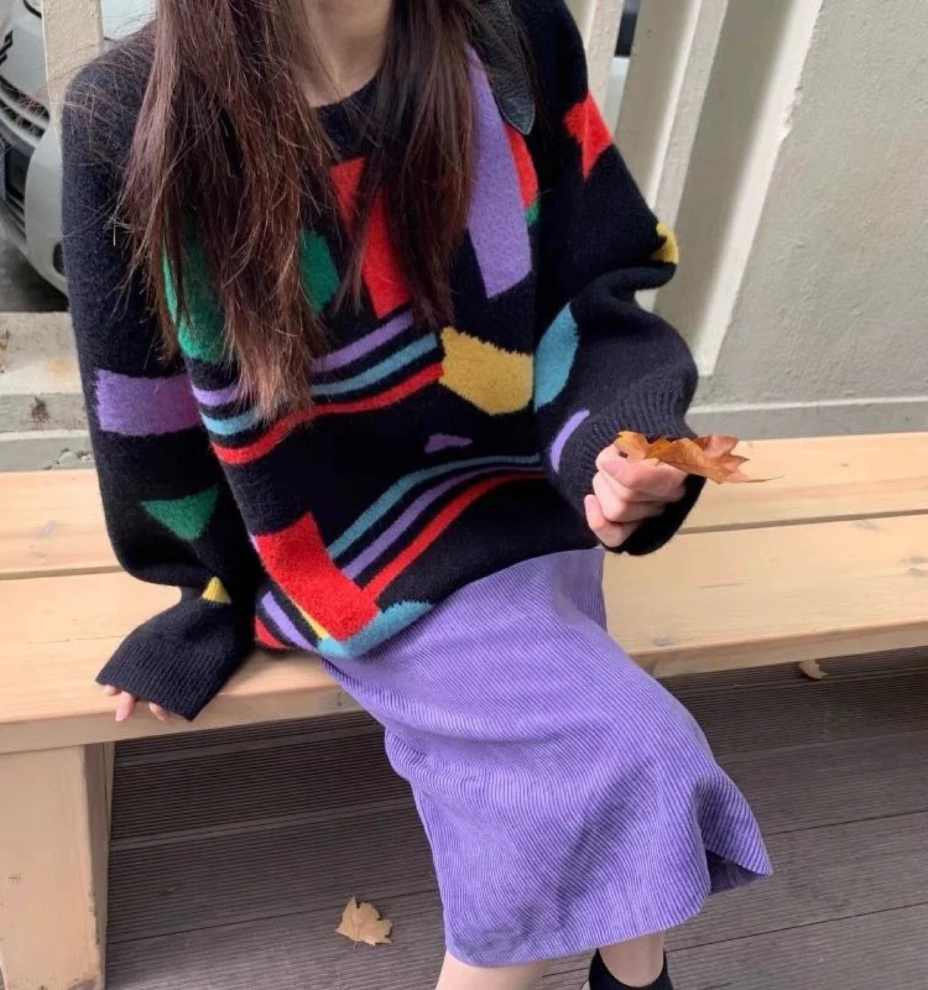 Colorful Geometric Knit Sweater & Purple Corduroy Skirt Set