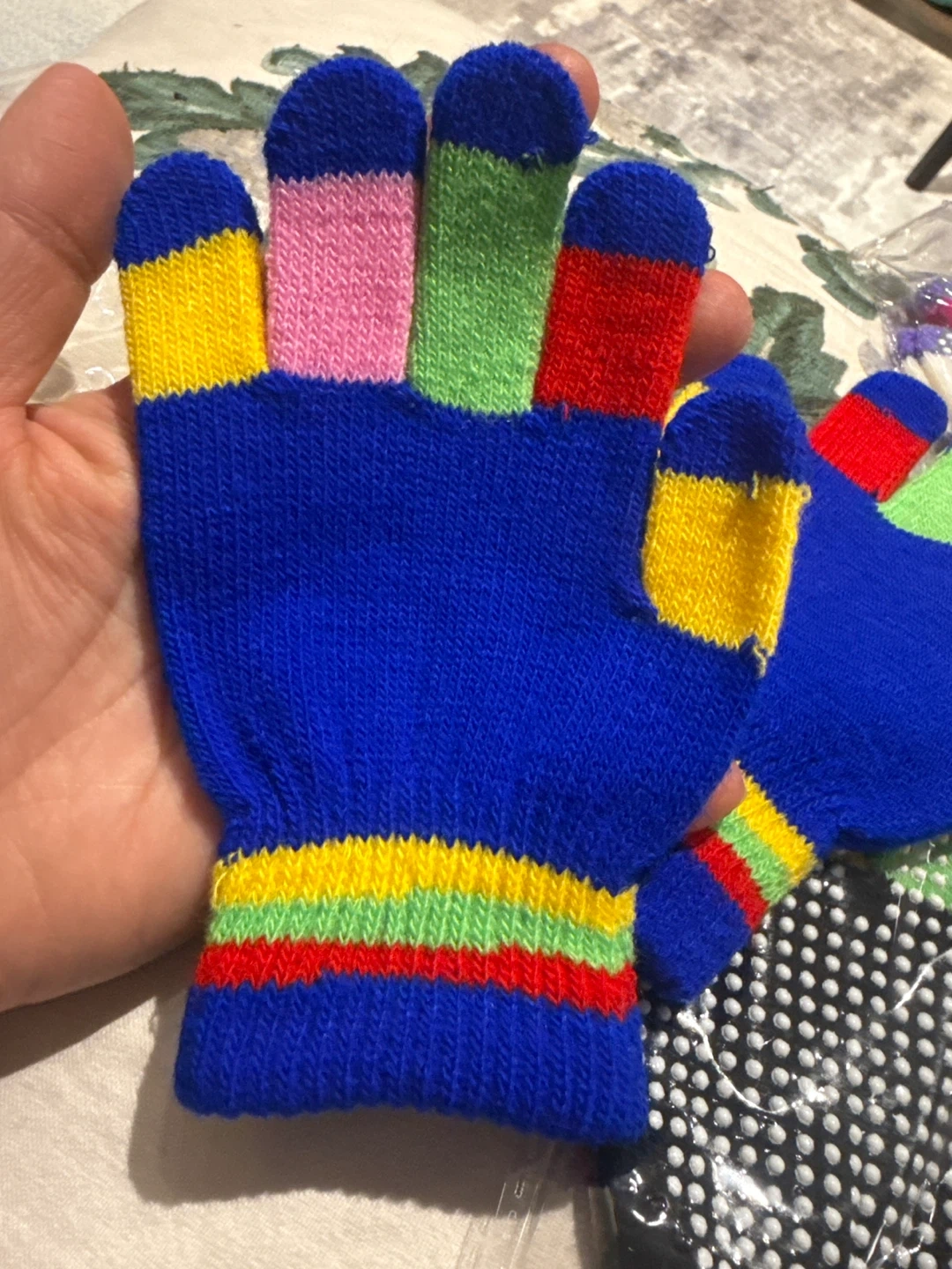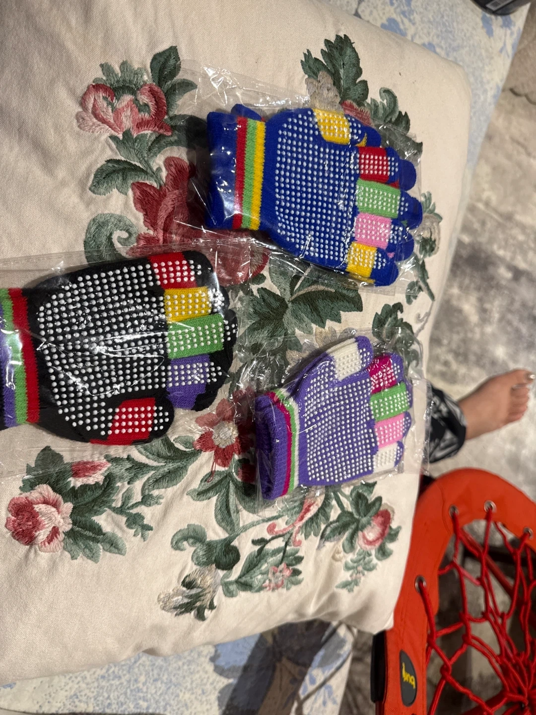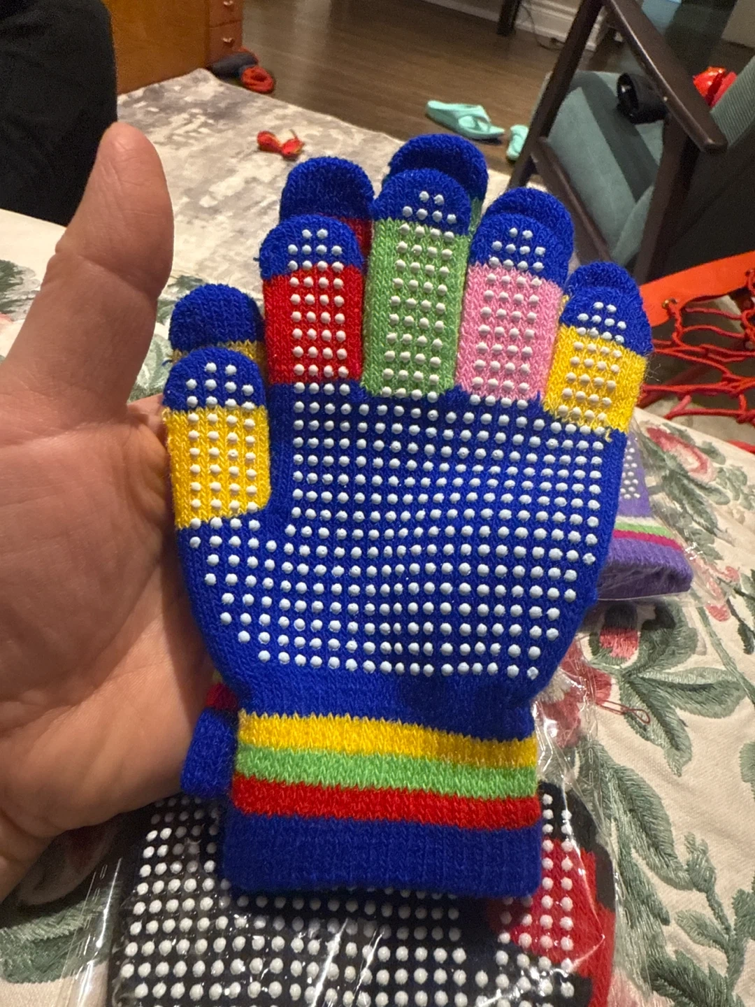 18I have some brand new colorful gripper gloves for sale! They come in a variety of colours and have little grippers on the palm. Great for kids!