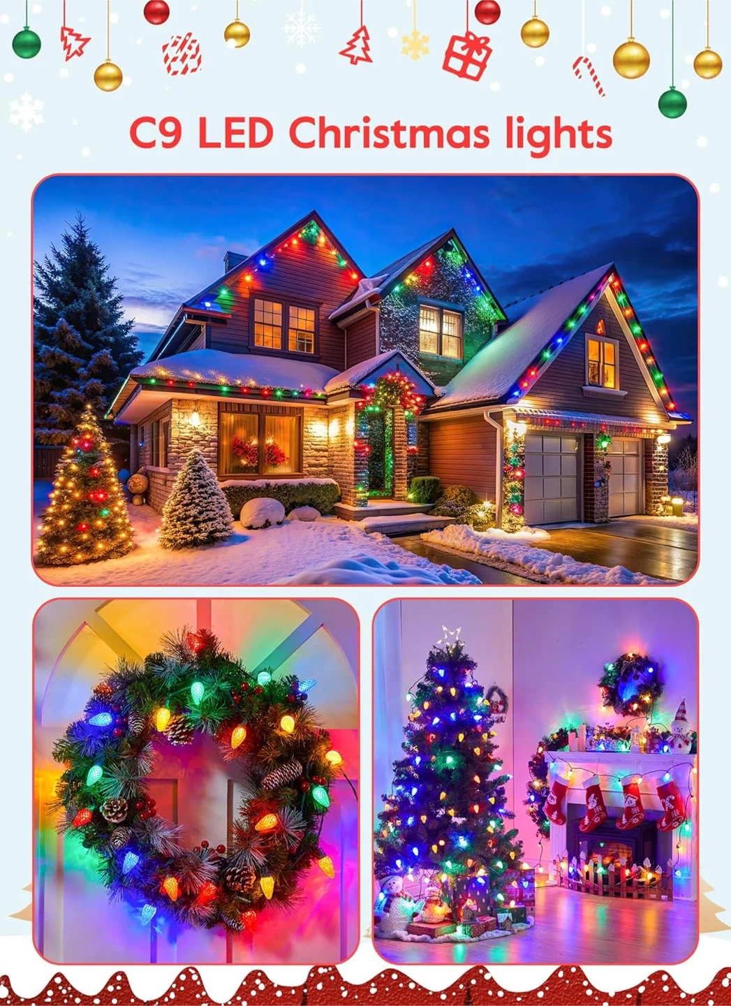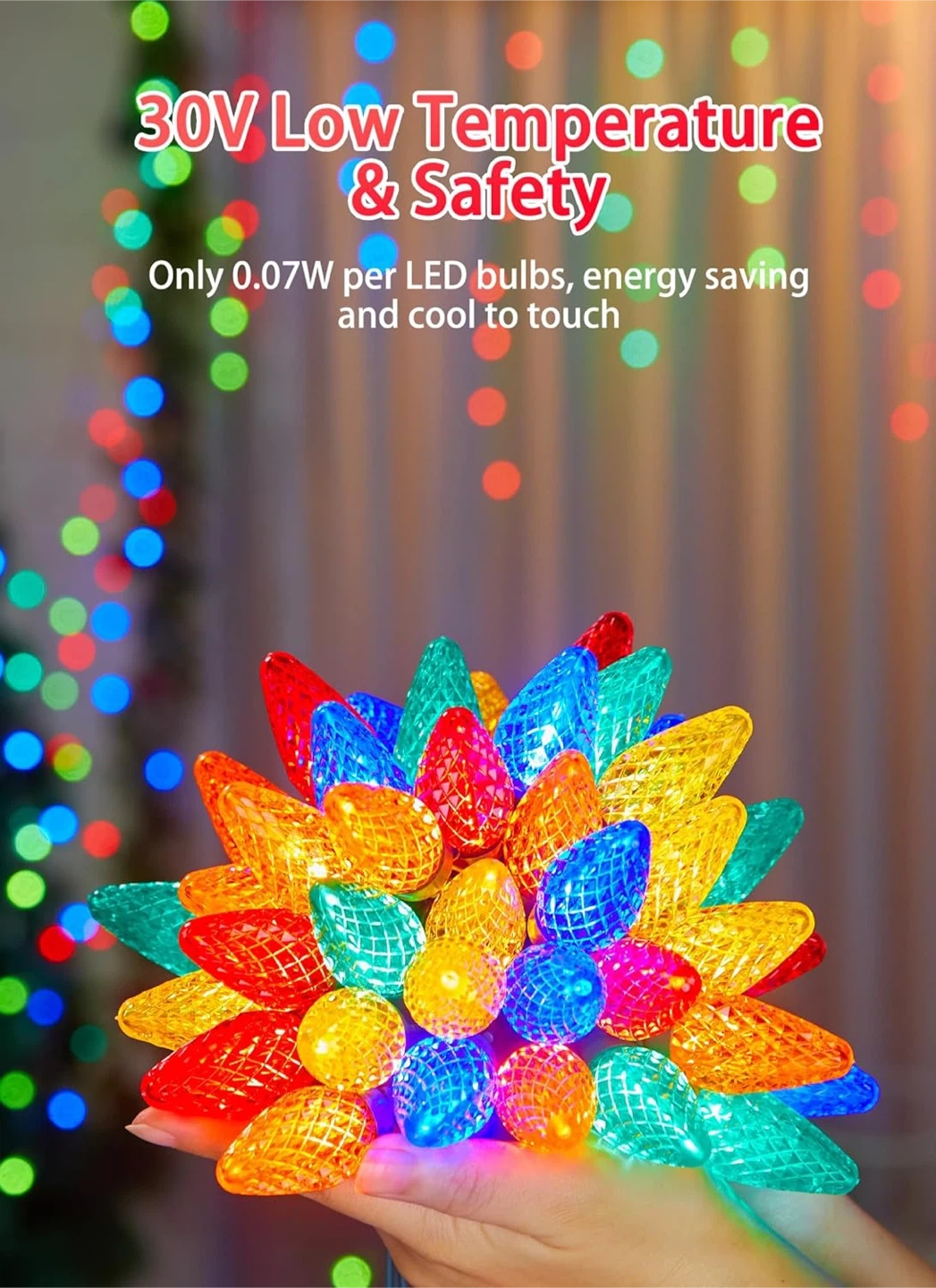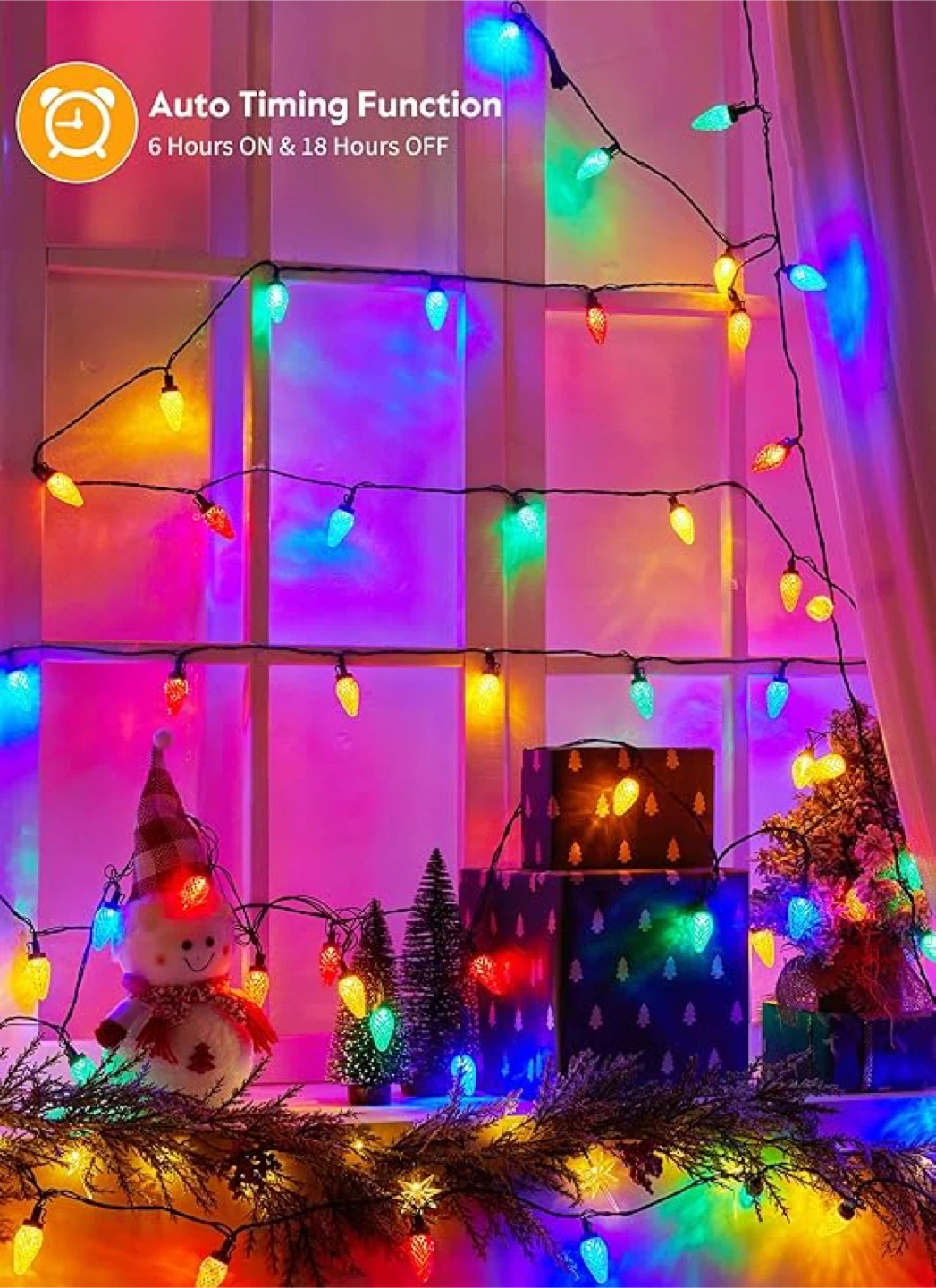 10Add a festive touch to your home with these colourful LED Christmas string lights! They feature 100 bulbs and are energy-saving, using only 0.07W per bulb. The lights are also cool to the touch and have a low temperature for safety. They are waterproof, shatterproof, freeze-proof, and wind-proof. You can connect up to 3 sets in total. They also have an auto timing function (6 hours on and 18 hours off)