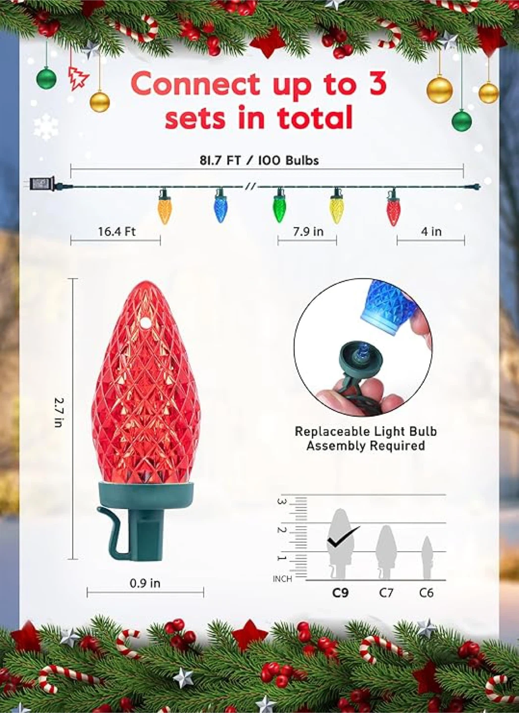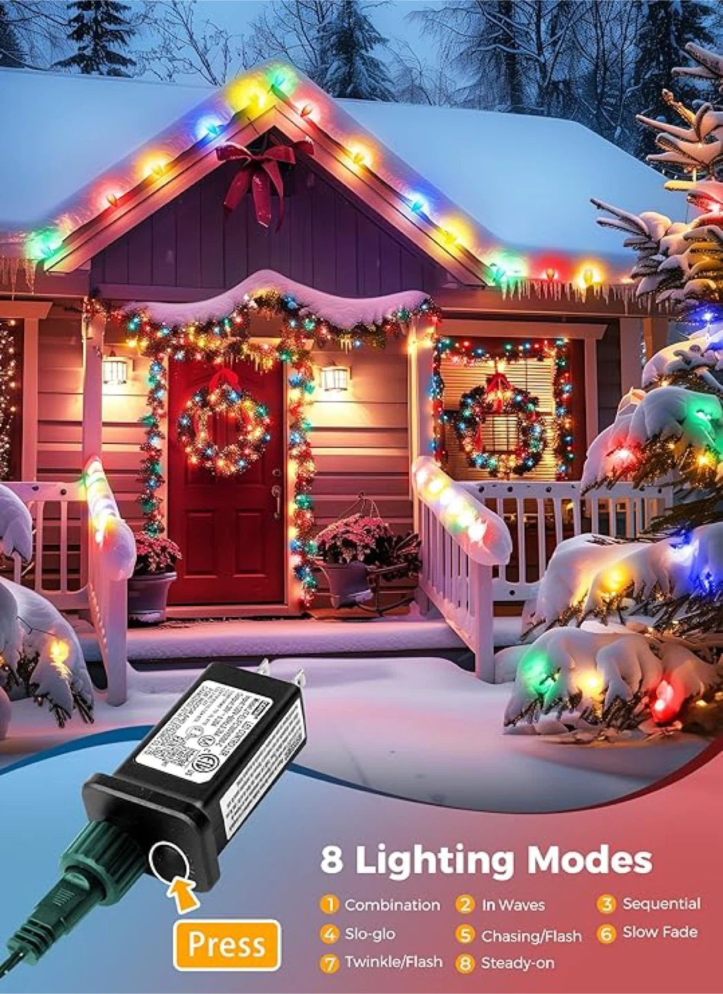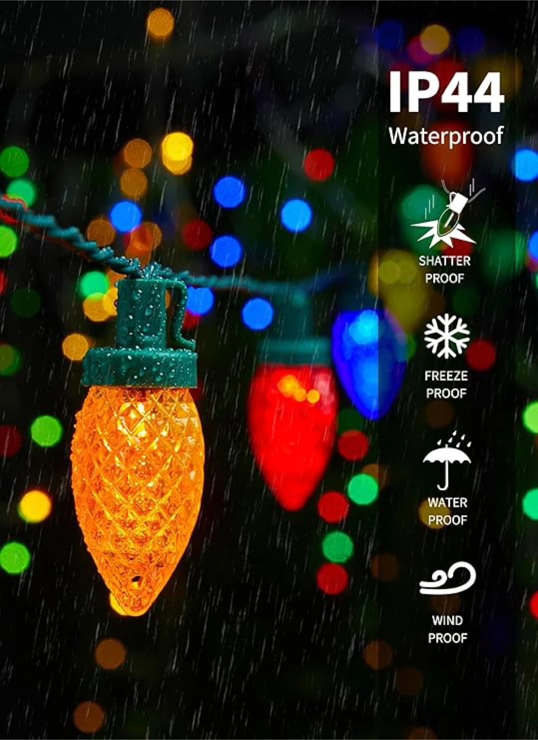 10Add a festive touch to your home with these colourful LED Christmas string lights! They feature 100 bulbs and are energy-saving, using only 0.07W per bulb. The lights are also cool to the touch and have a low temperature for safety. They are waterproof, shatterproof, freeze-proof, and wind-proof. You can connect up to 3 sets in total. They also have an auto timing function (6 hours on and 18 hours off)