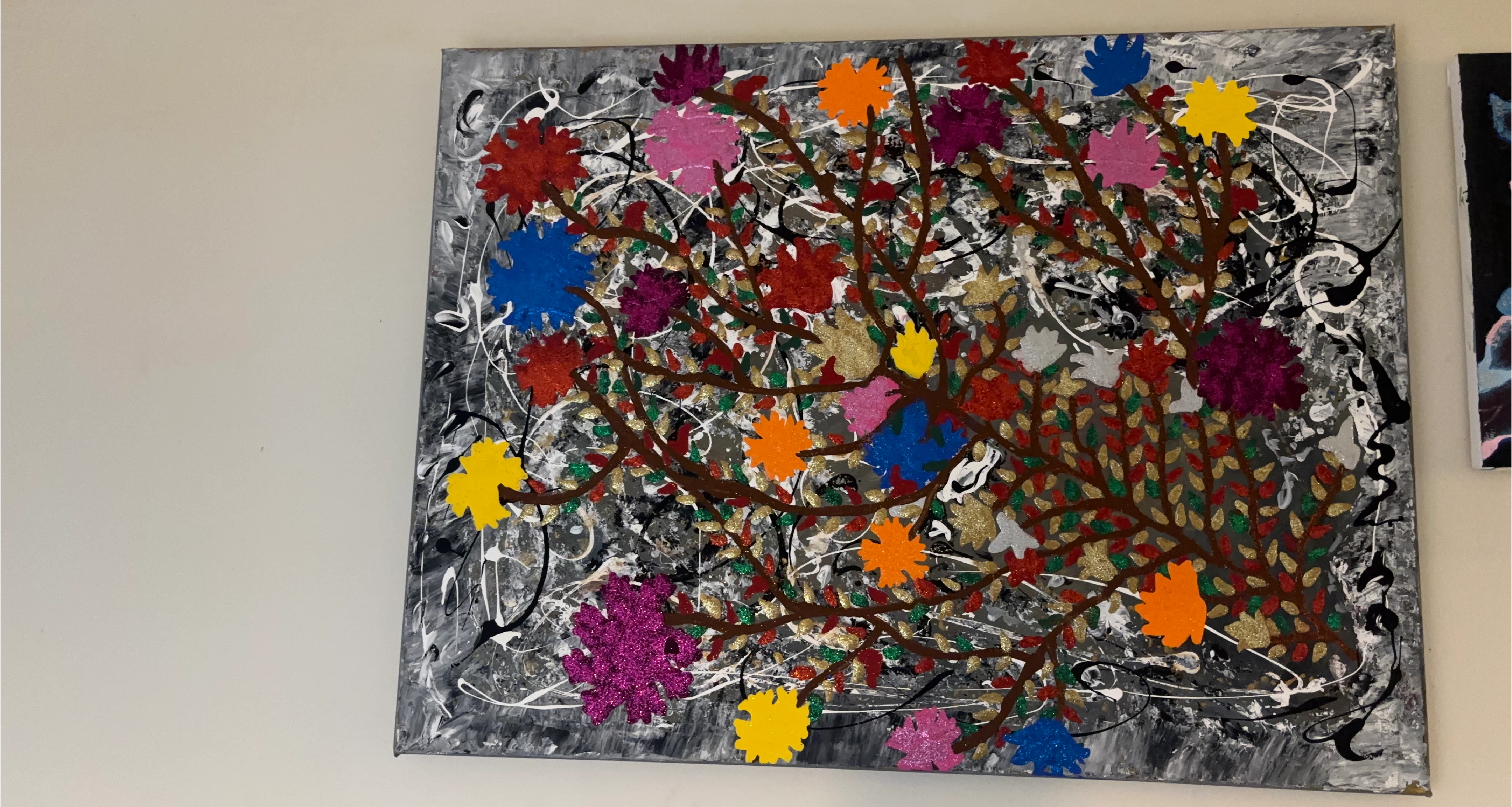 65A vibrant and eye-catching painting featuring a tree with colourful leaves and flowers on a grey background with white and black accents. Perfect for adding a pop of colour to any room!