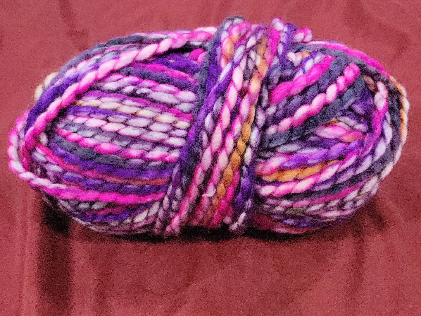 Here's a skein of colourful yarn! It features a mix of purple, pink, white, and grey colours. Perfect for your next knitting or crochet project