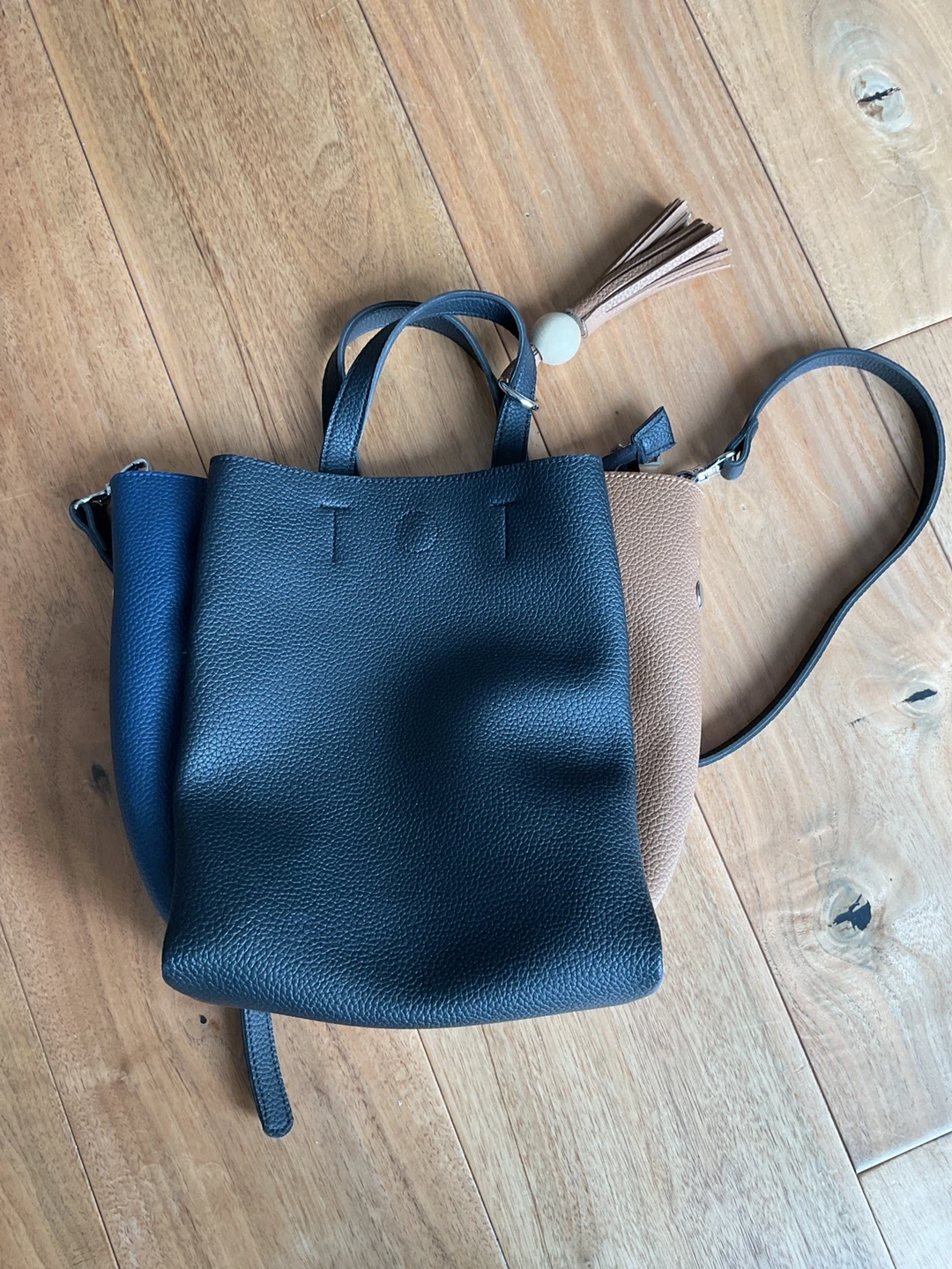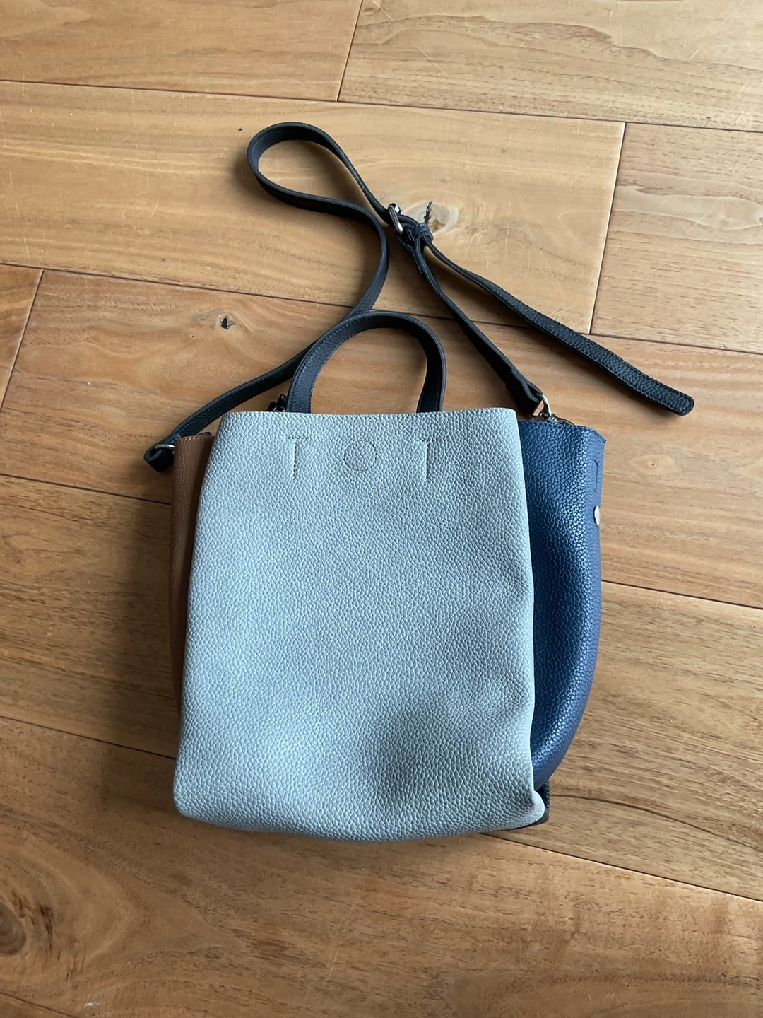 Here's a stylish colour block tote bag! It features a unique design with brown, blue, grey and black panels. Perfect for everyday use and adding a pop of colour to your outfit!