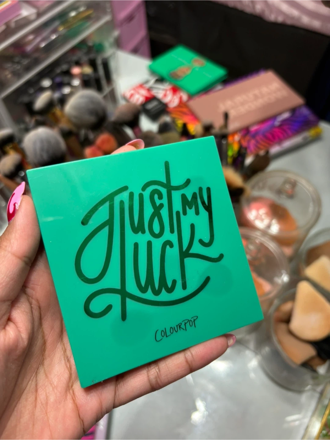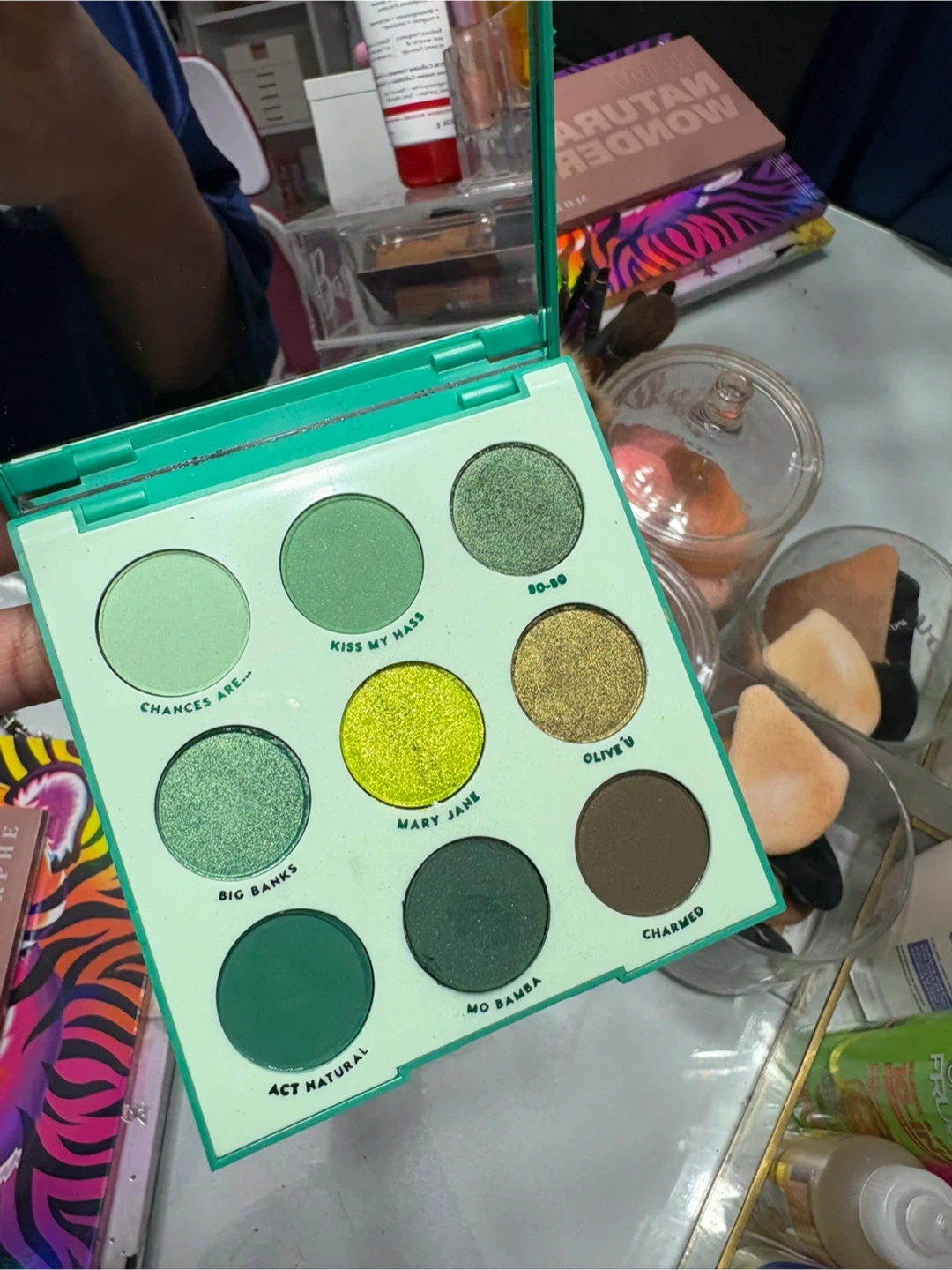 Selling a ColourPop Just My Luck pressed powder palette. It features a range of green shades with names like Chances Are..., Kiss My Hass, Big Banks, Mary Jane, Act Natural, Mo Bamba, Olive U, 50-50, and Charmed! Perfect for creating fun and vibrant eye looks