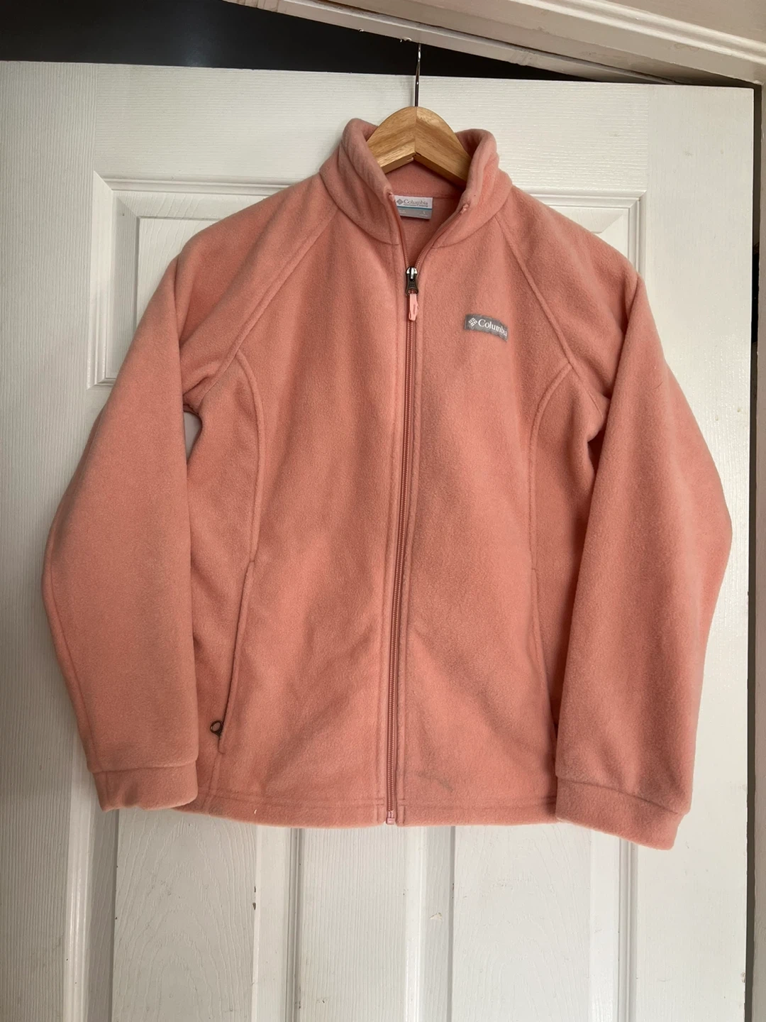 374A cozy Columbia fleece jacket in a lovely peach colour! It's a size large for kids or Small for Ladies. .and in great condition. Perfect for layering or wearing on its own during cooler days. The material is soft and comfortable, making it a great addition to your wardrobe!