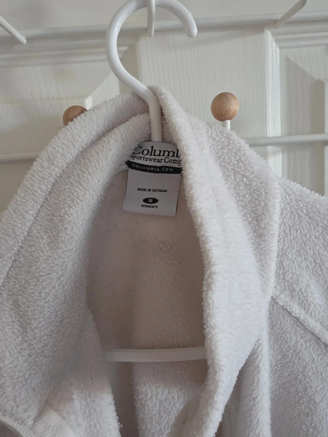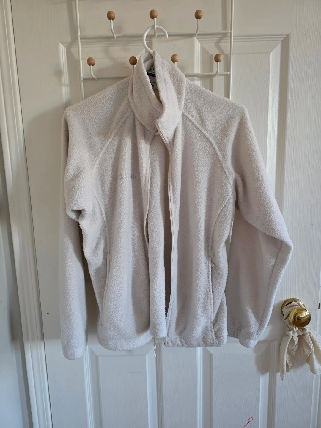87Cozy Columbia fleece jacket in a lovely off-white colour! It's a women's size small and perfect for layering or wearing on its own during cooler days. Great for staying warm and comfortable!