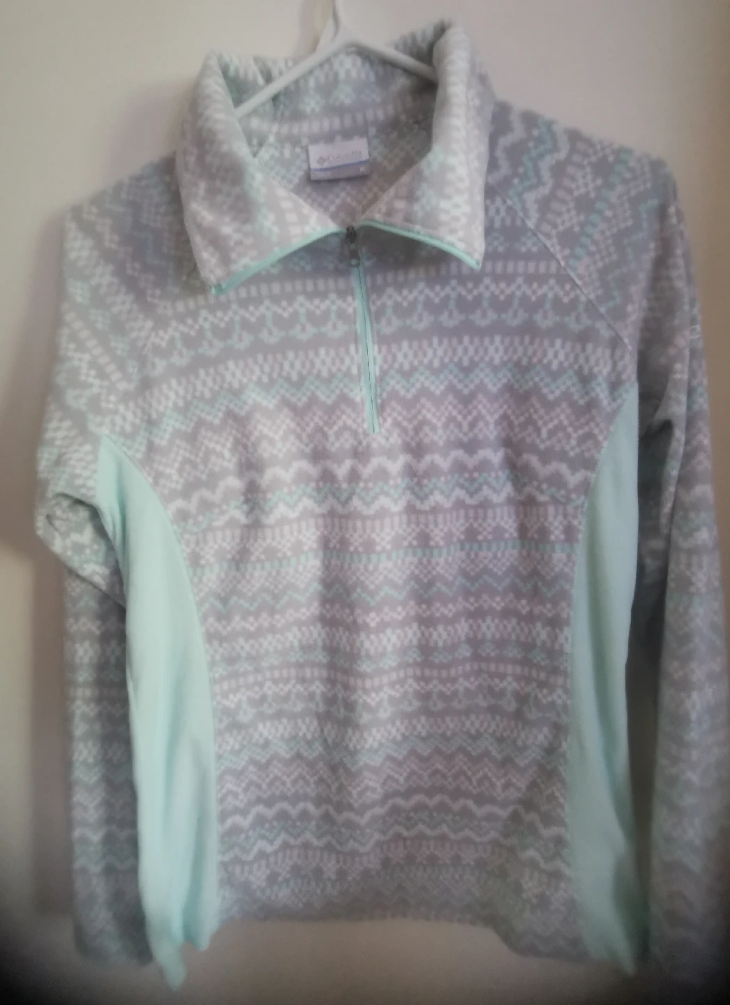 15Cozy Columbia fleece pullover in a grey and mint pattern! Perfect for layering or wearing on its own. It's in great condition and ready for a new home
