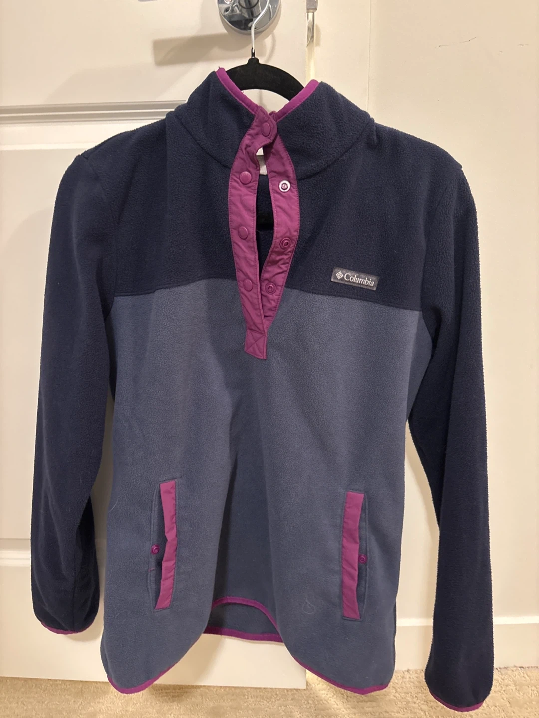 32Selling a comfy Columbia fleece pullover in size medium! It's in great condition and perfect for layering on those chilly days. The colours are a lovely mix of navy, grey, and a pop of purple on the buttons and trim. It's made of soft fleece material, so it's super cozy!