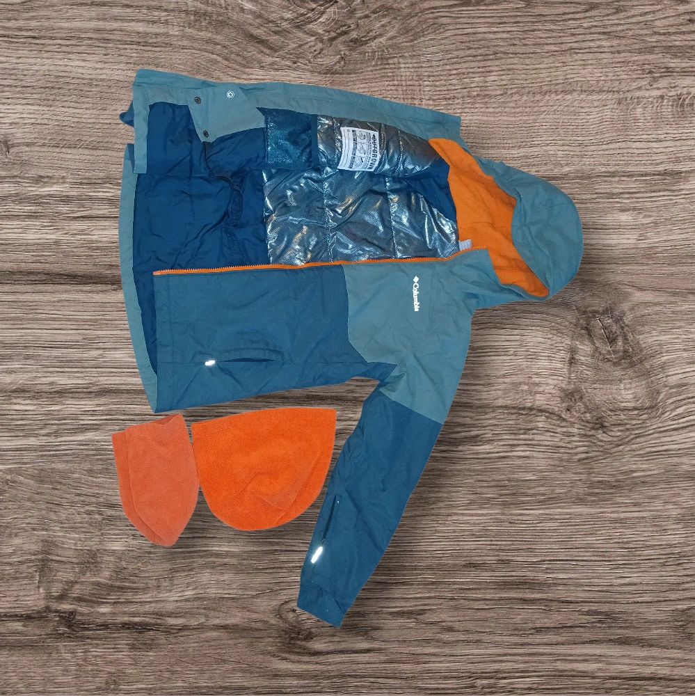Selling a Columbia Winter jacket featuring a stylish blue and orange colour scheme! It looks to be in great condition and would be perfect for outdoor activities or everyday wear. The jacket includes a hood and has a reflective strip on the sleeve for visibility