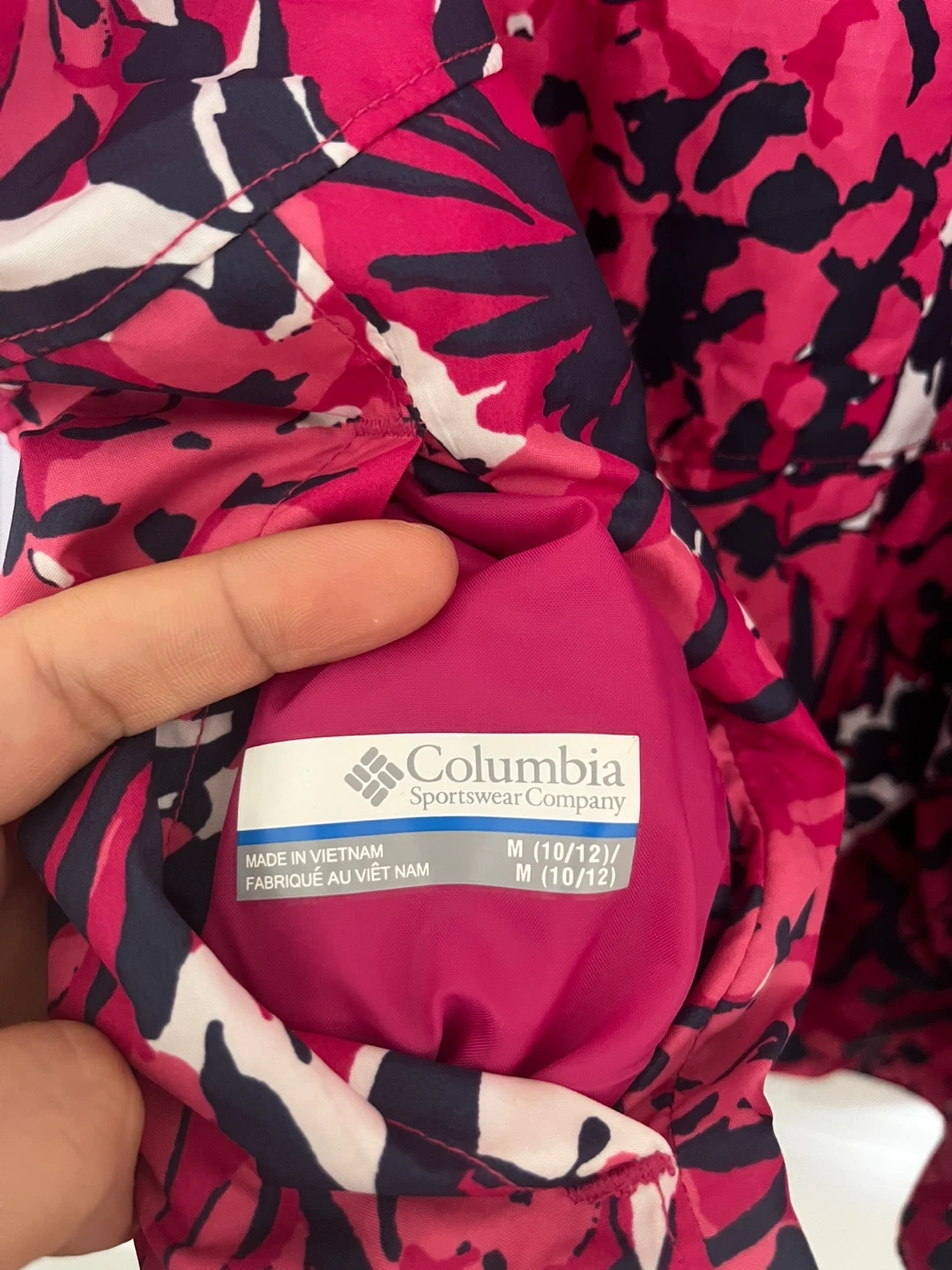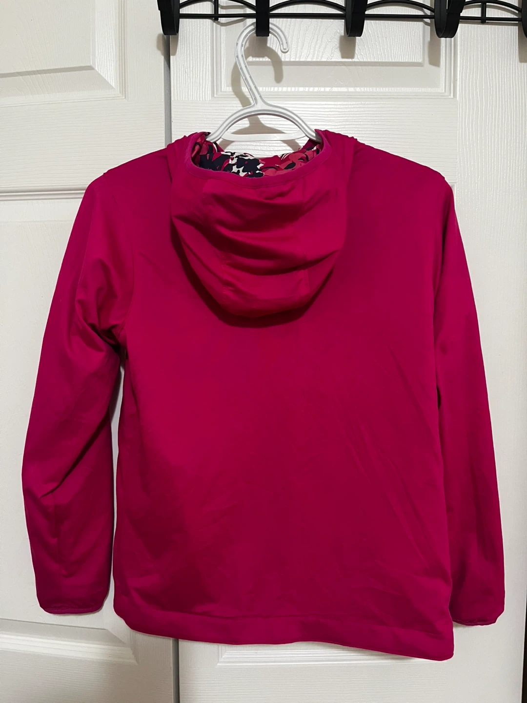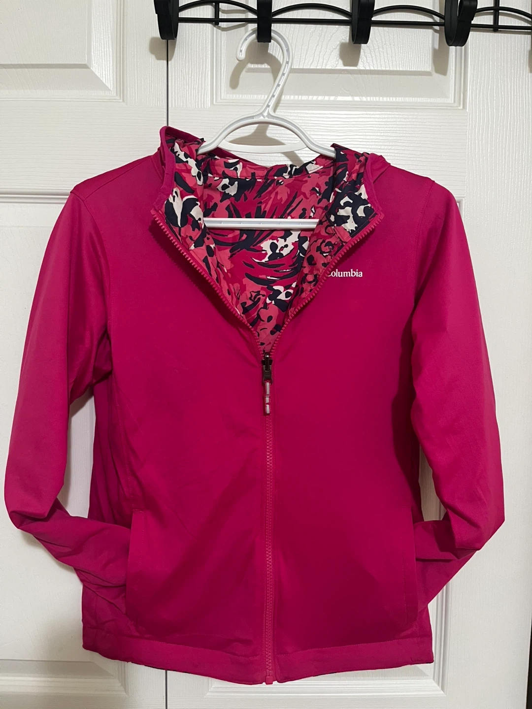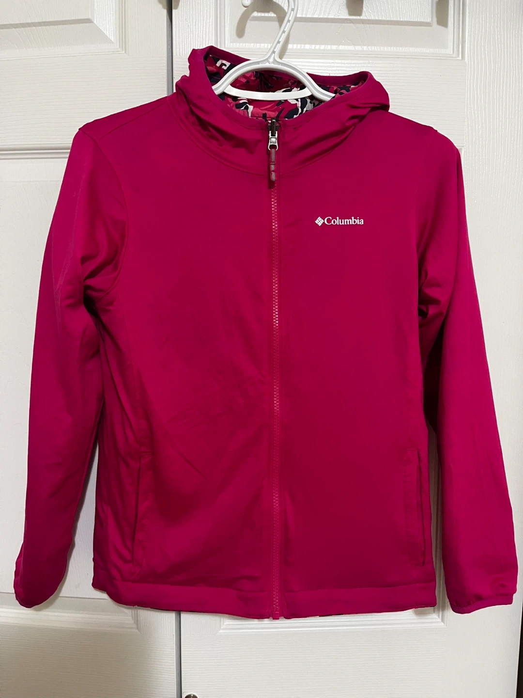 Columbia, water resistance & reversible jacket with a floral pattern on one side and a solid pink/magenta colour on the other. It features a hood and a full zipper. Great for layering!