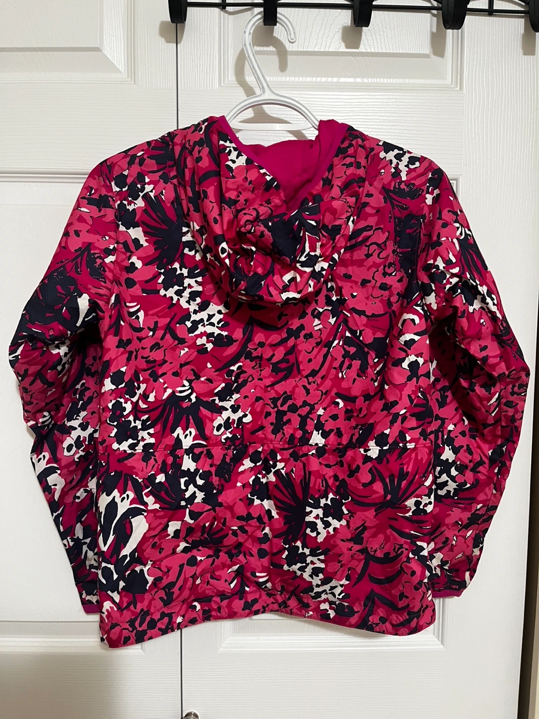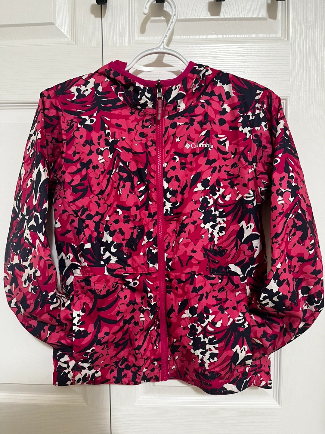 Columbia, water resistance & reversible jacket with a floral pattern on one side and a solid pink/magenta colour on the other. It features a hood and a full zipper. Great for layering!