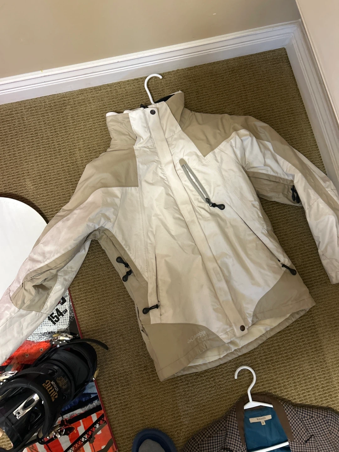 Selling a Columbia Titanium ski jacket in beige and white. It's in great condition and ready for the slopes! Features a durable, waterproof design to keep you warm and dry. Perfect for skiing or snowboarding this winter
