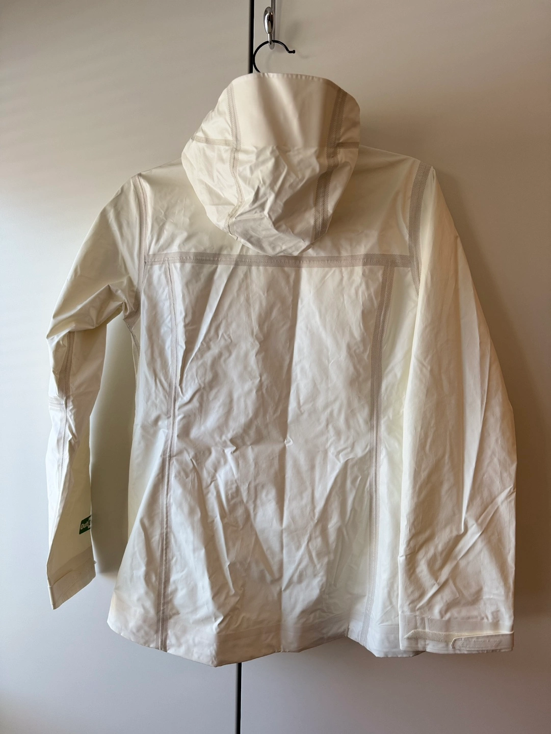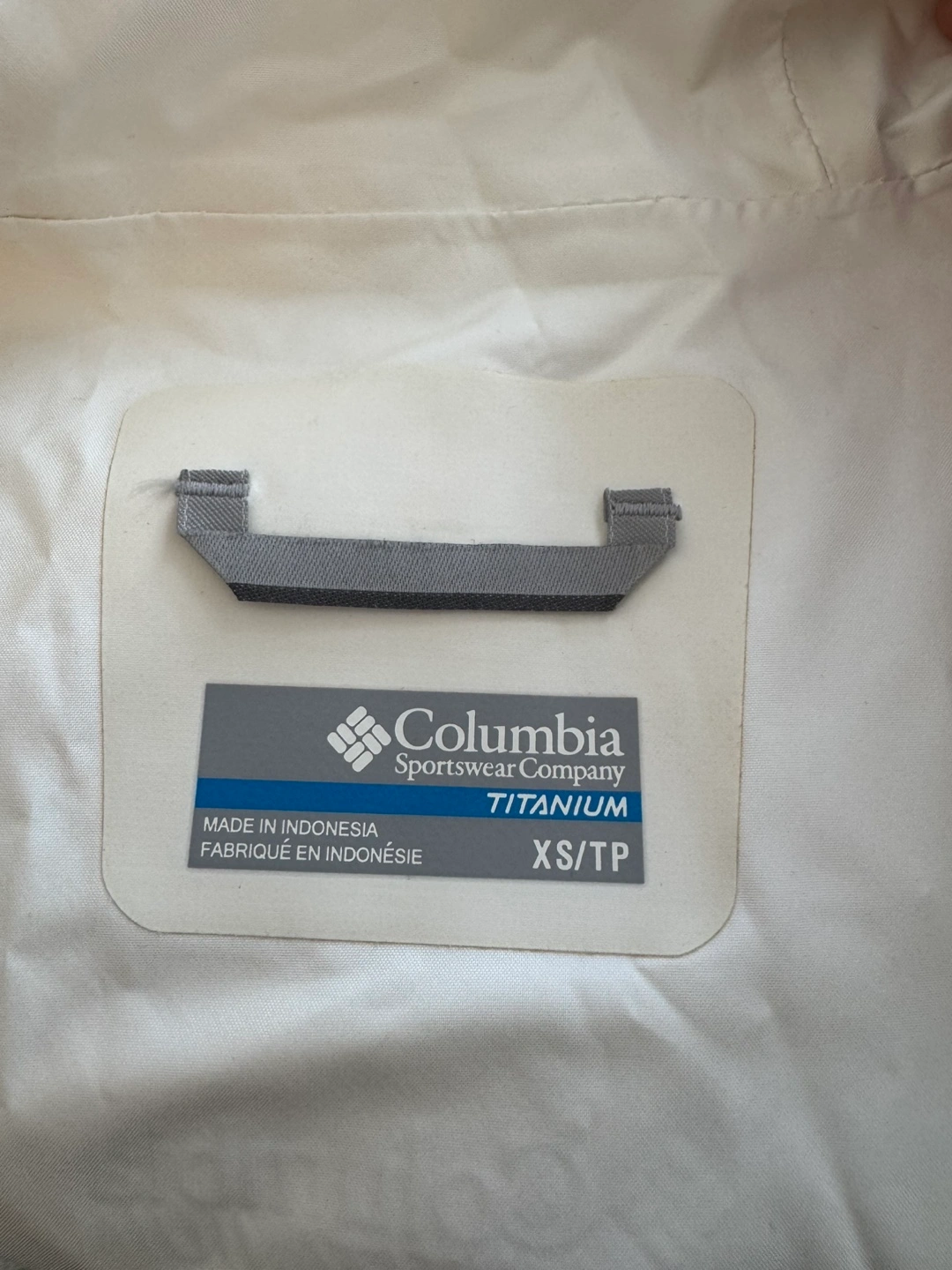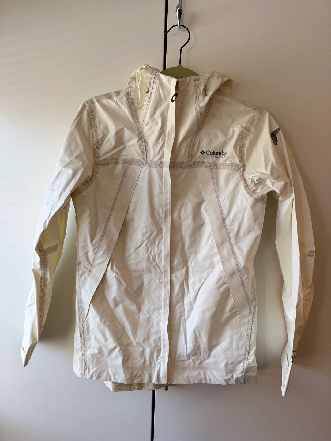 Cream-coloured women's jacket. Size XS. Features a hood and zipper closure. Great condition.
