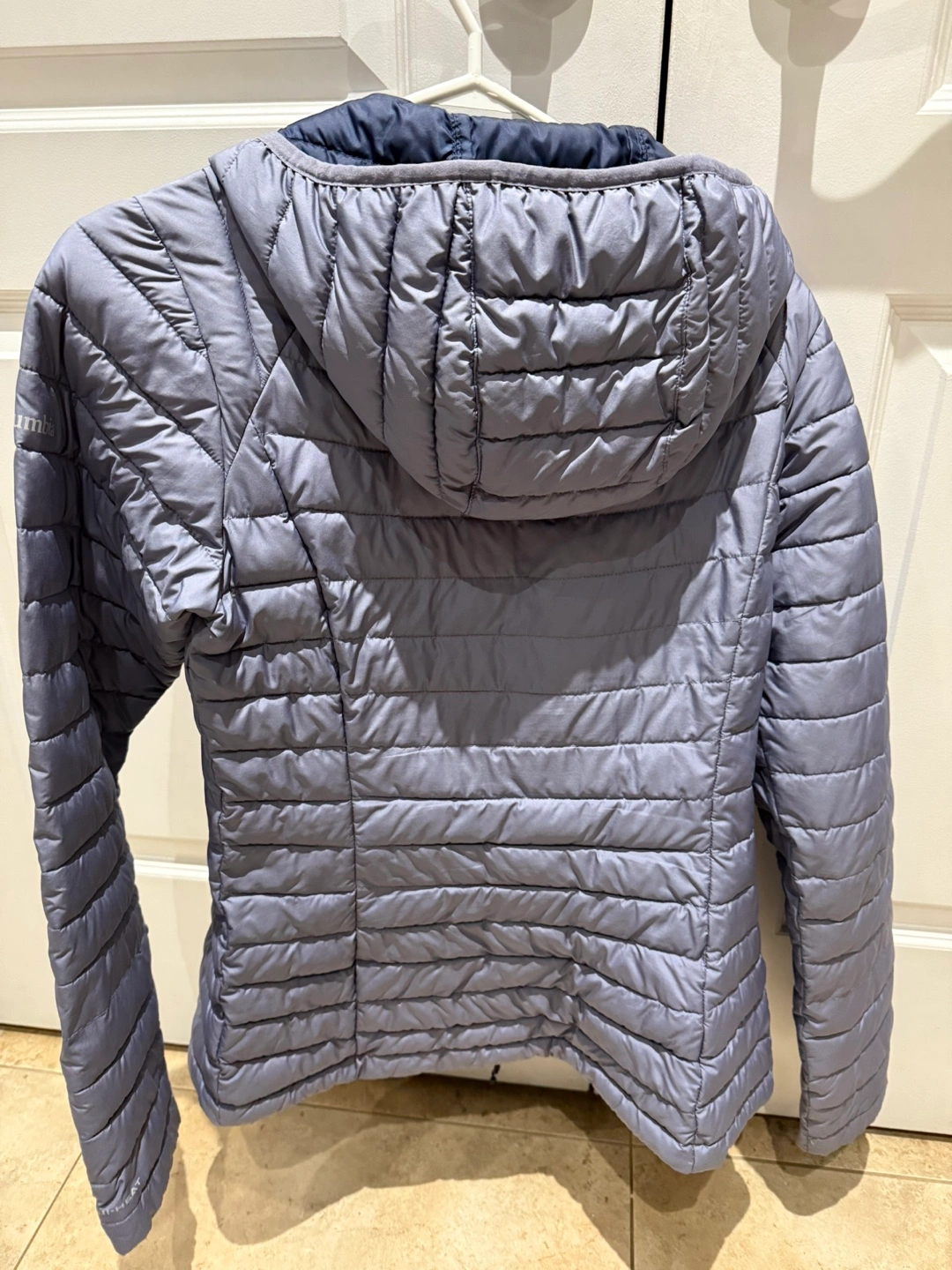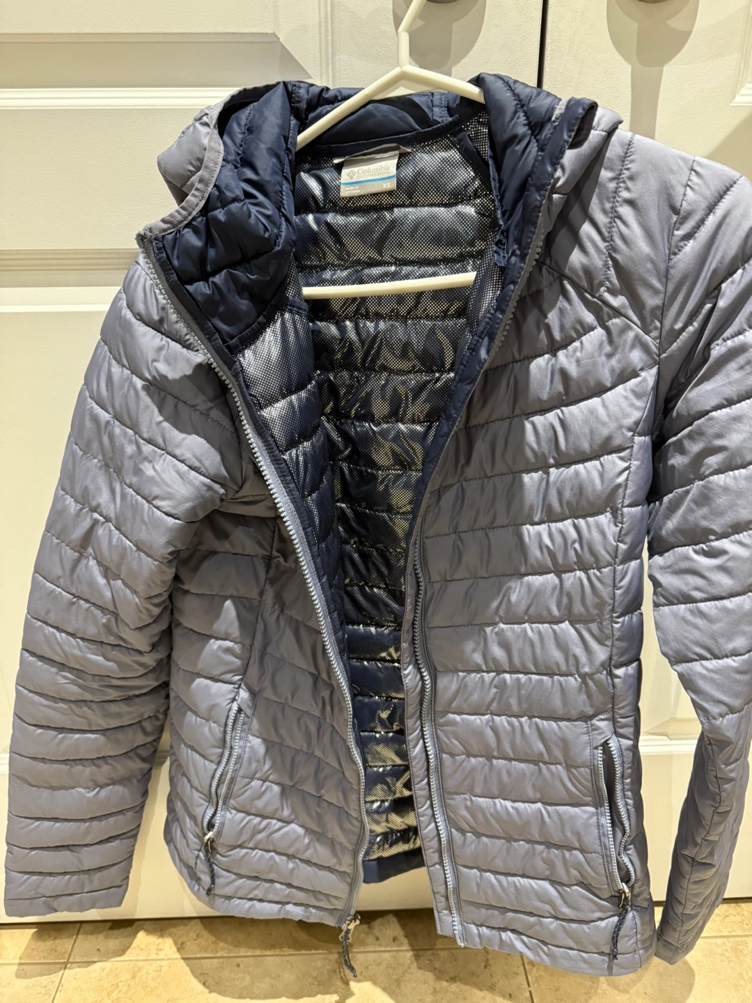 Lightweight puffer jacket. Gray exterior, navy blue interior. Zip front closure. Attached hood. Side pockets. Excellent condition.