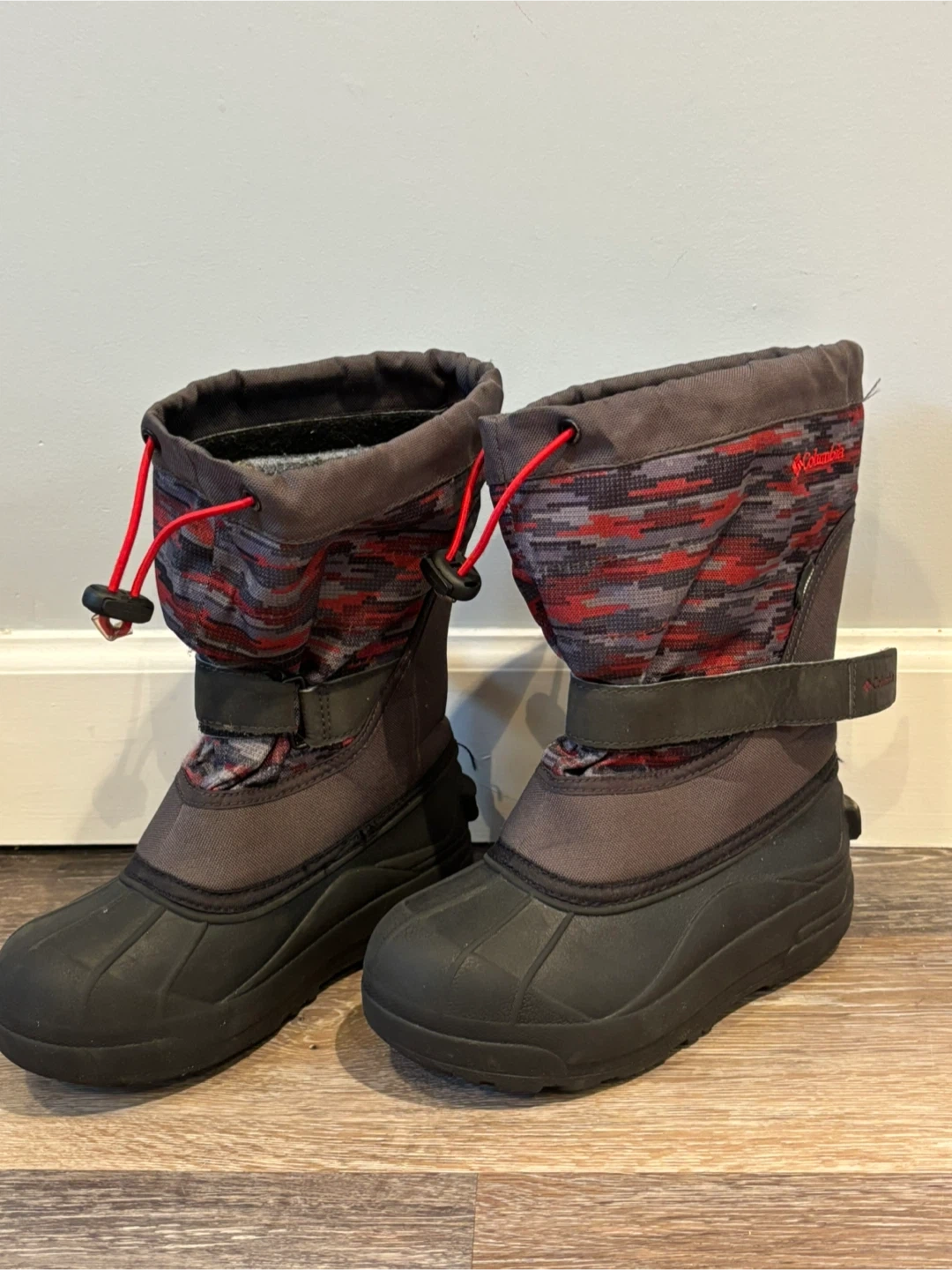 12Youth snow boots from Columbia! They feature a black base with a grey and red patterned upper. Great for keeping little feet warm and dry during the winter months