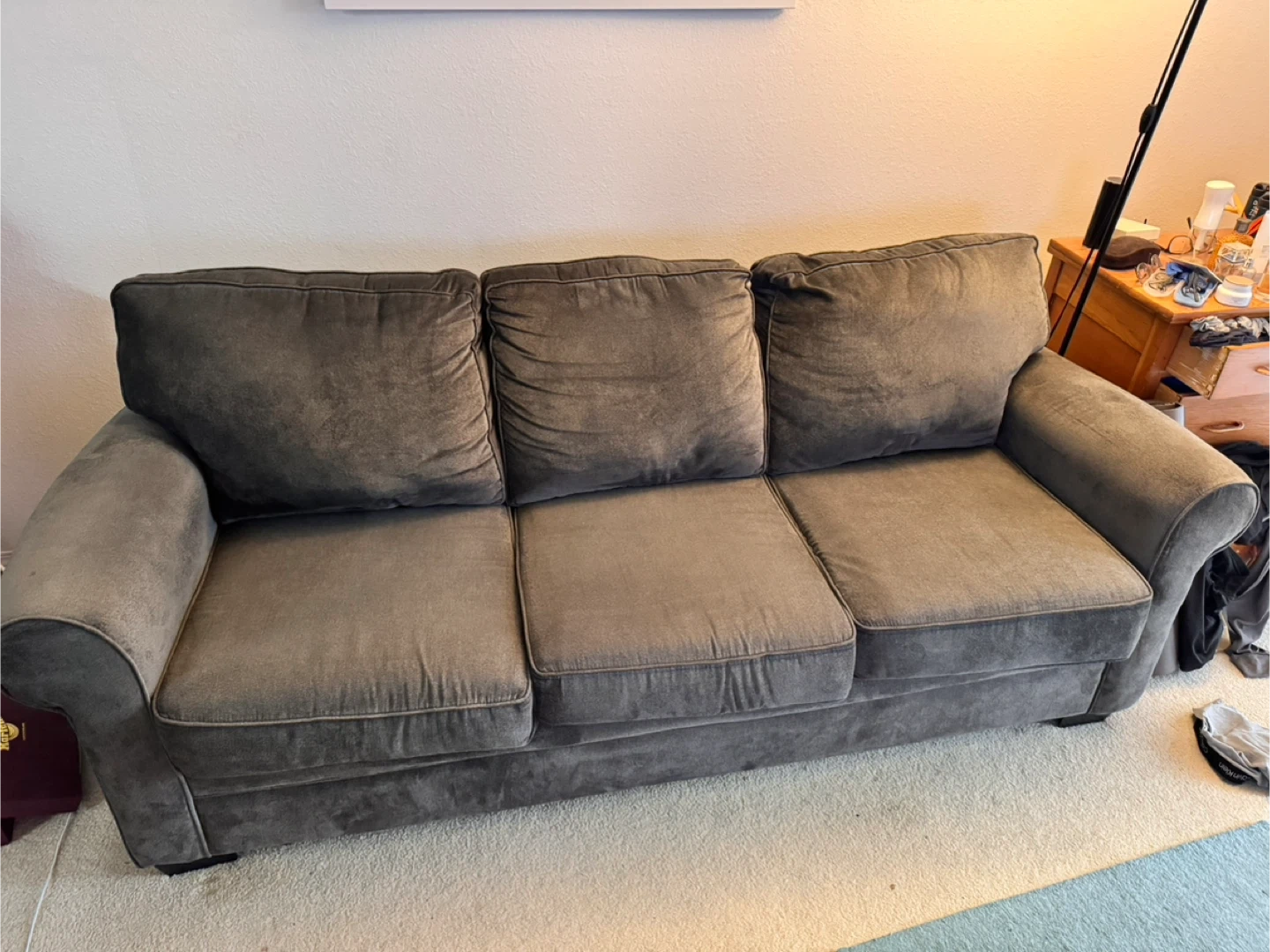 60Selling a comfy three-seat sofa! It's in good condition and perfect for a living room or den. The cushions are nice and plush, ready for relaxing evenings or movie nights. It's a great addition to any home looking for some extra seating