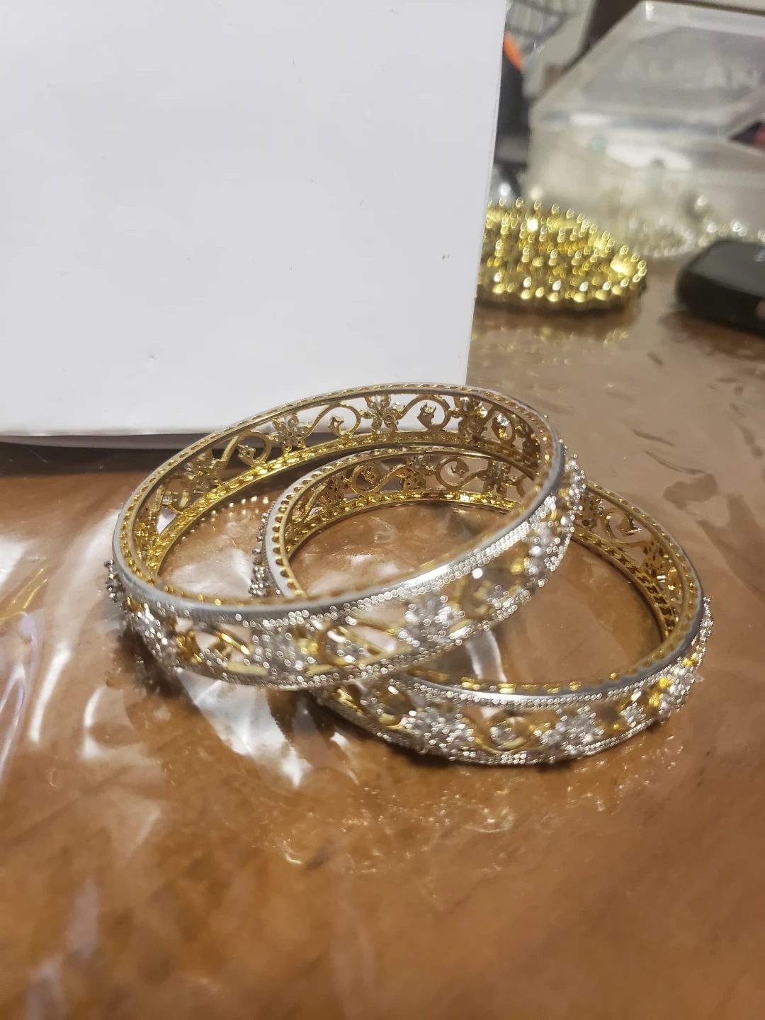 A set of two ornate bangles with intricate detailing and clear stones. They come with a decorative golden box for storage. Perfect for special occasions!