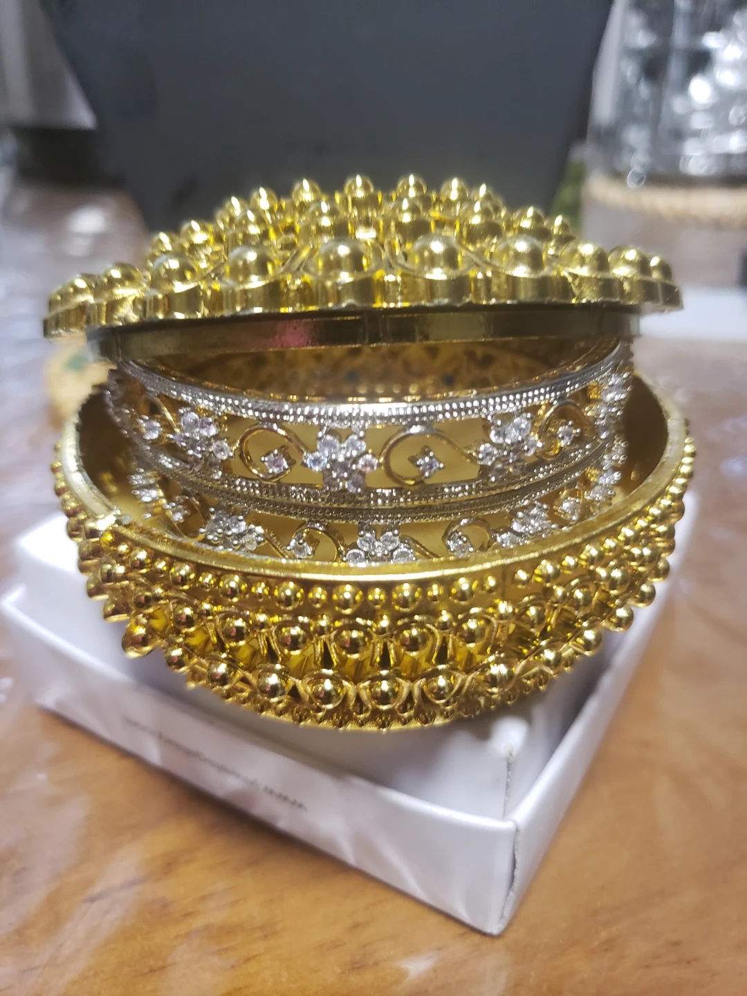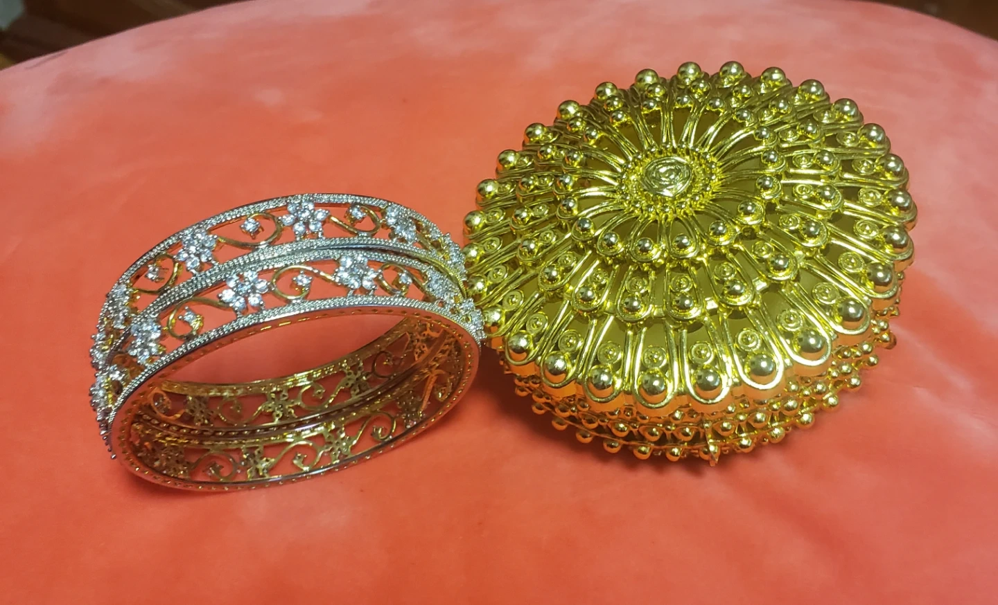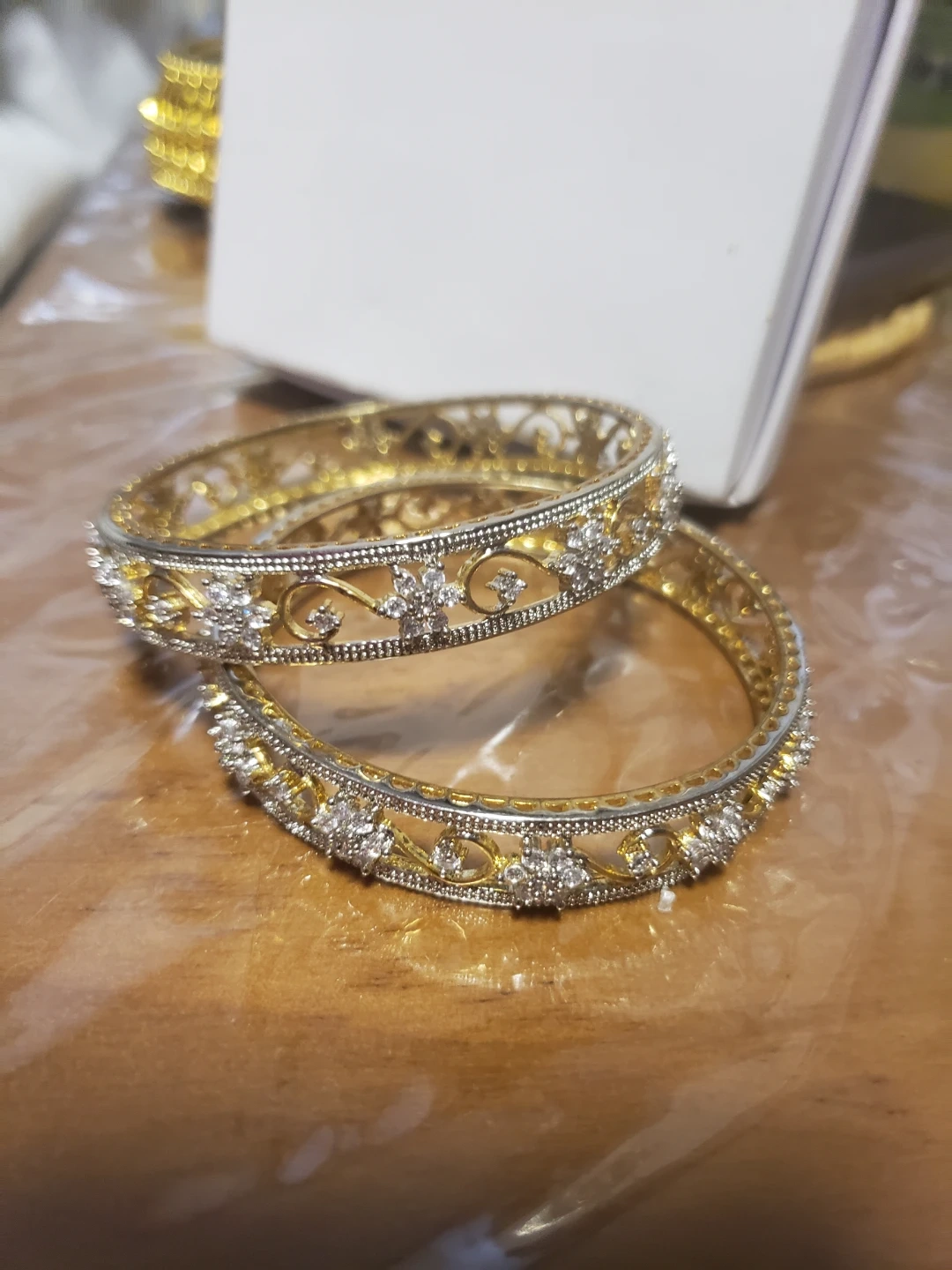 A set of two ornate bangles with intricate detailing and clear stones. They come with a decorative golden box for storage. Perfect for special occasions!