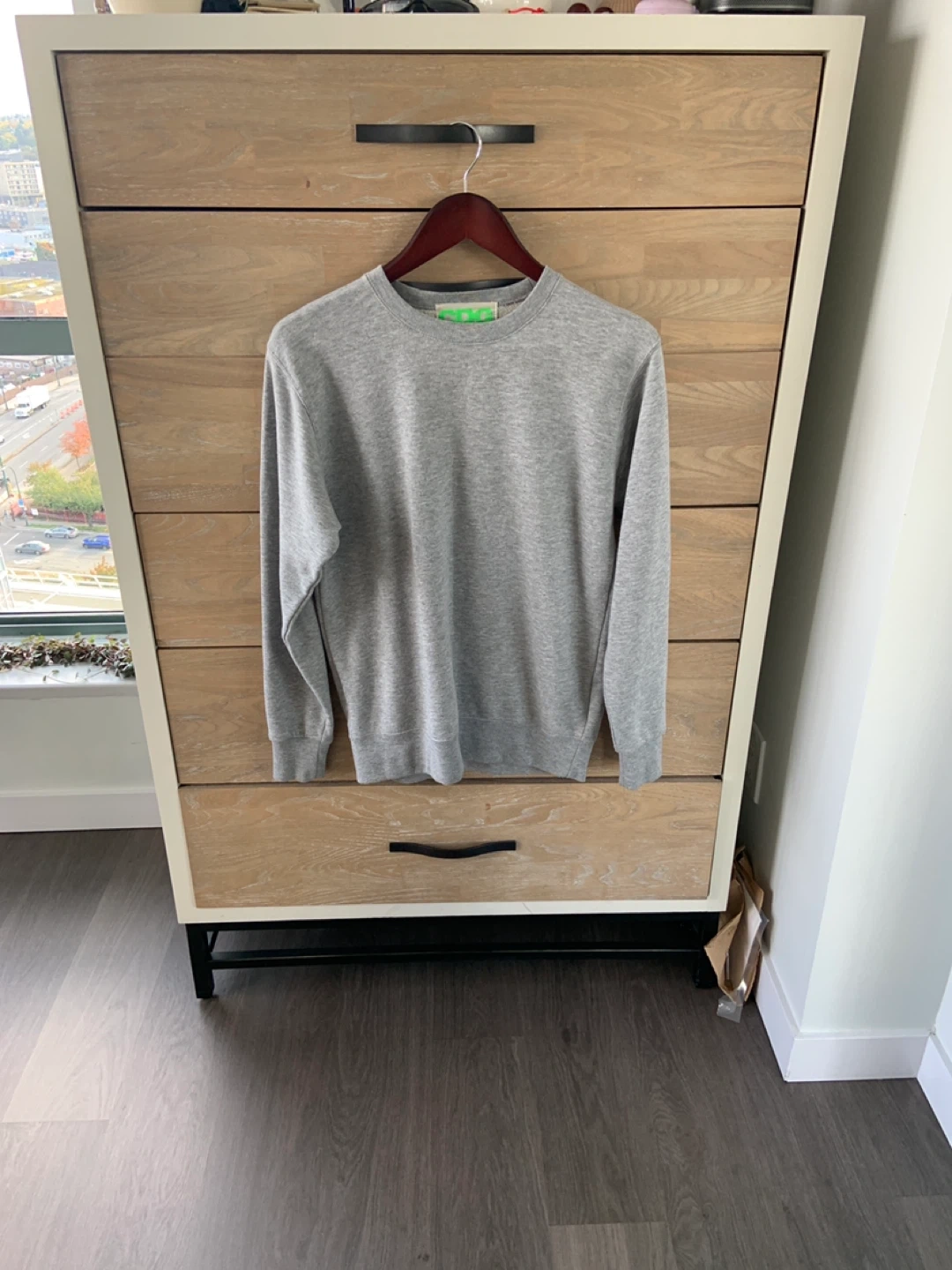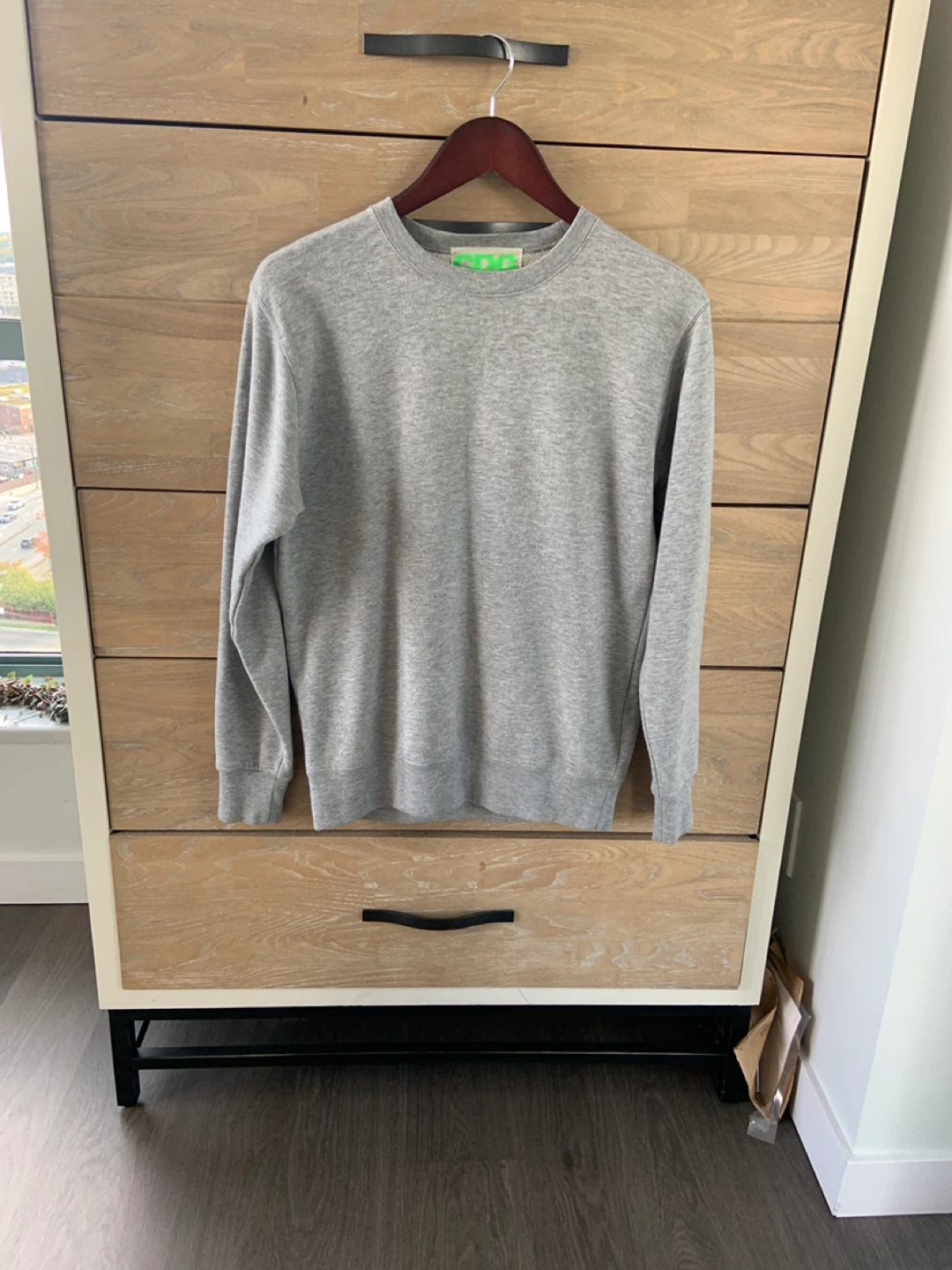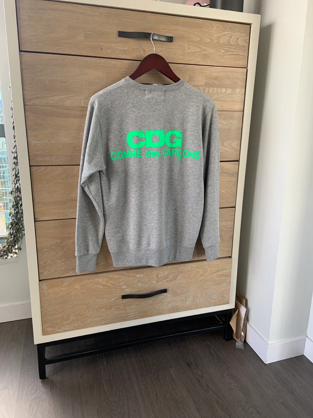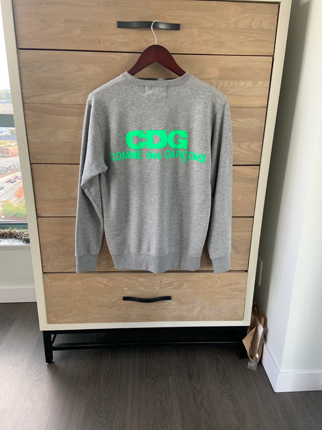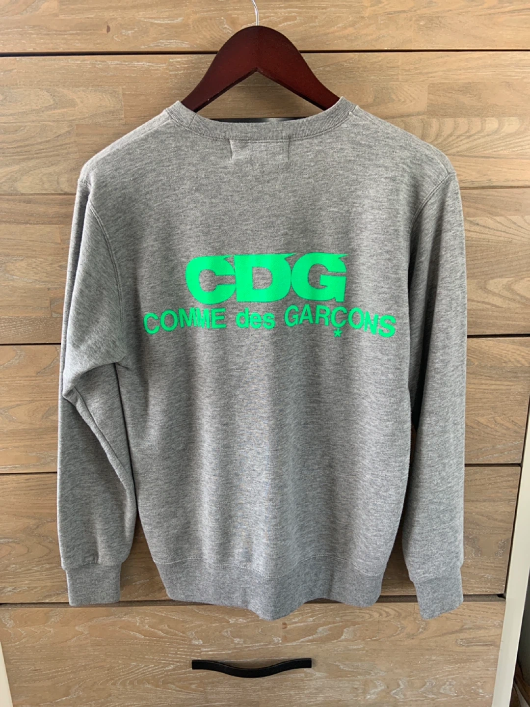 Selling a grey CDG (Comme des Garcons) sweatshirt. It has the CDG logo in bright green on the back. It's in great condition and ready for a new home! Fits mens size small women’s small/medium