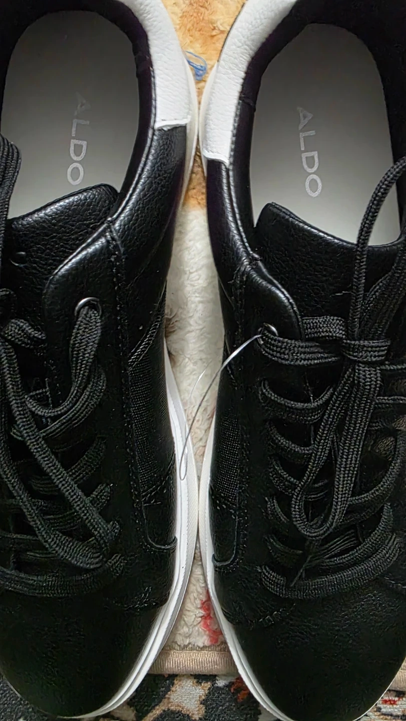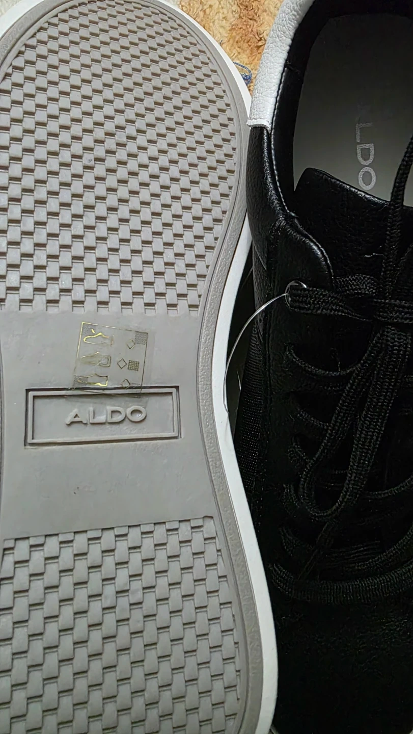 ALDO men's black leather sneakers. These stylish kicks feature a classic lace-up design with a contrasting white heel tab. The US size is 10. They're made in China. These sneakers are suitable for everyday wear.
