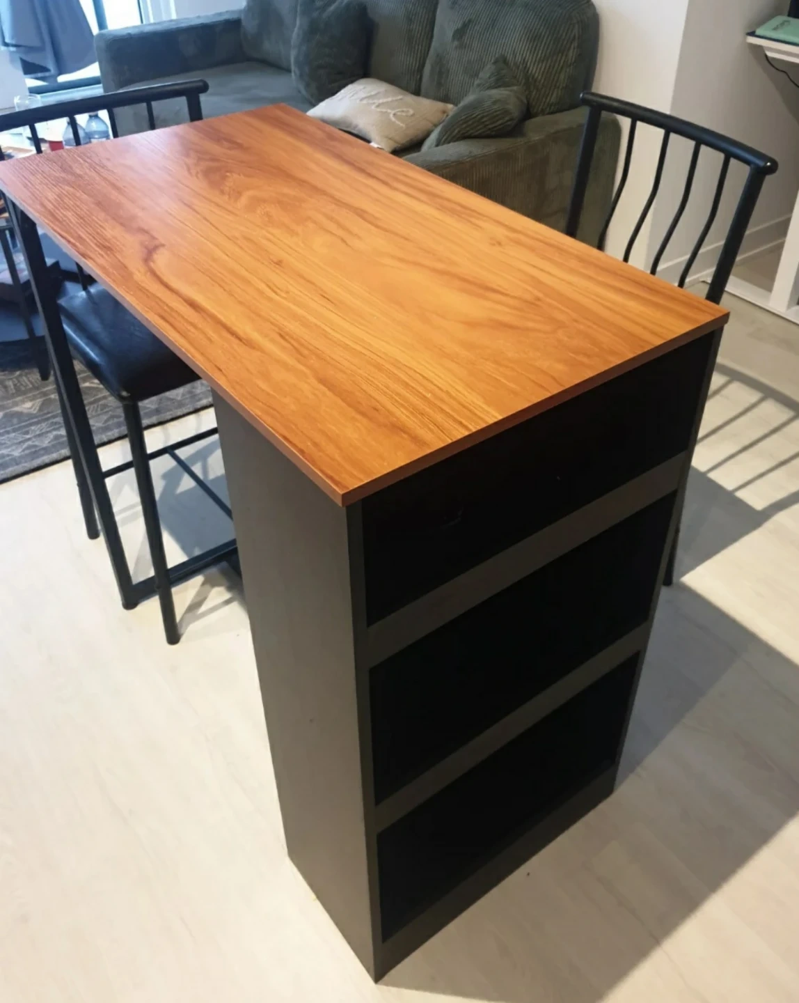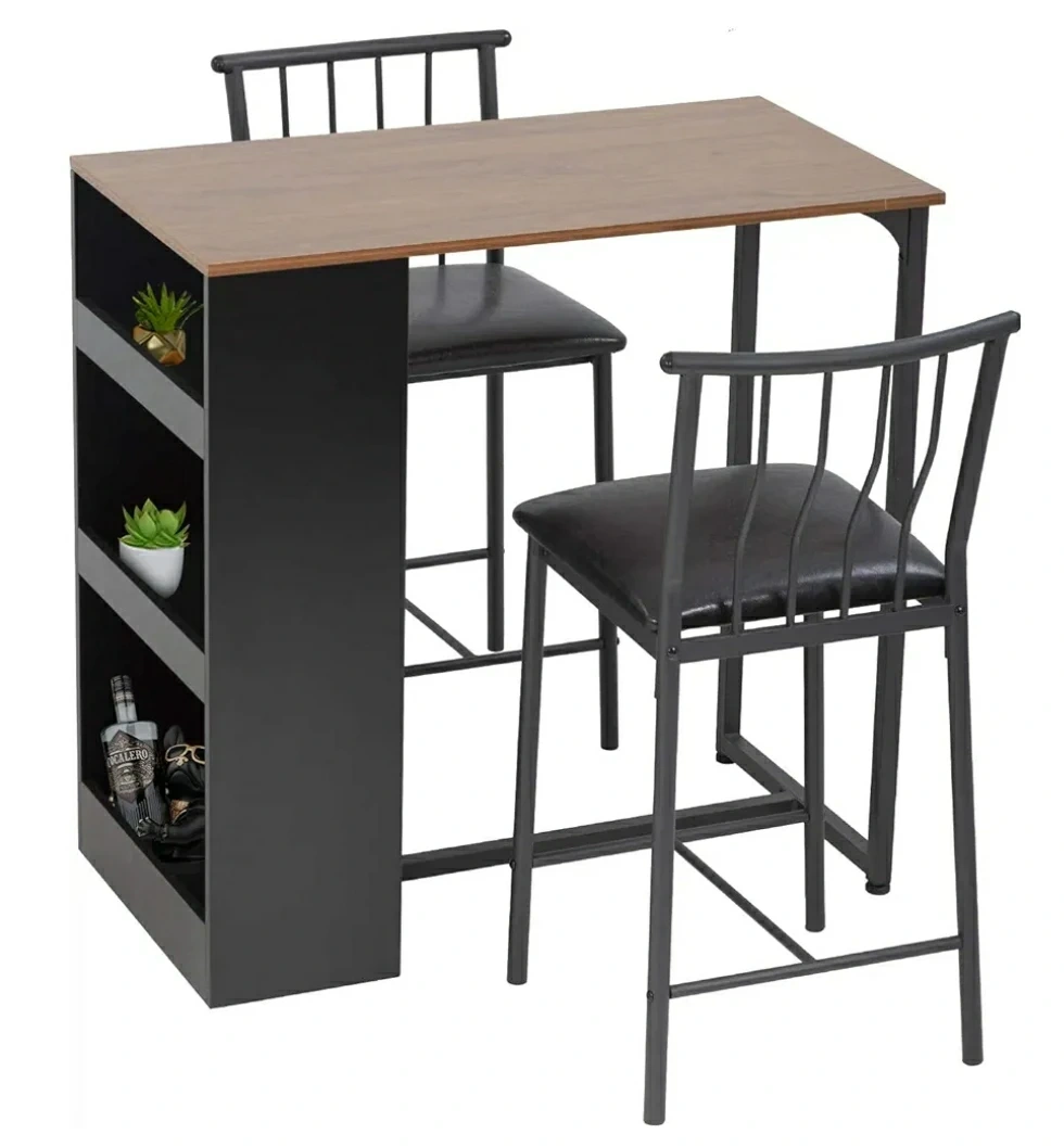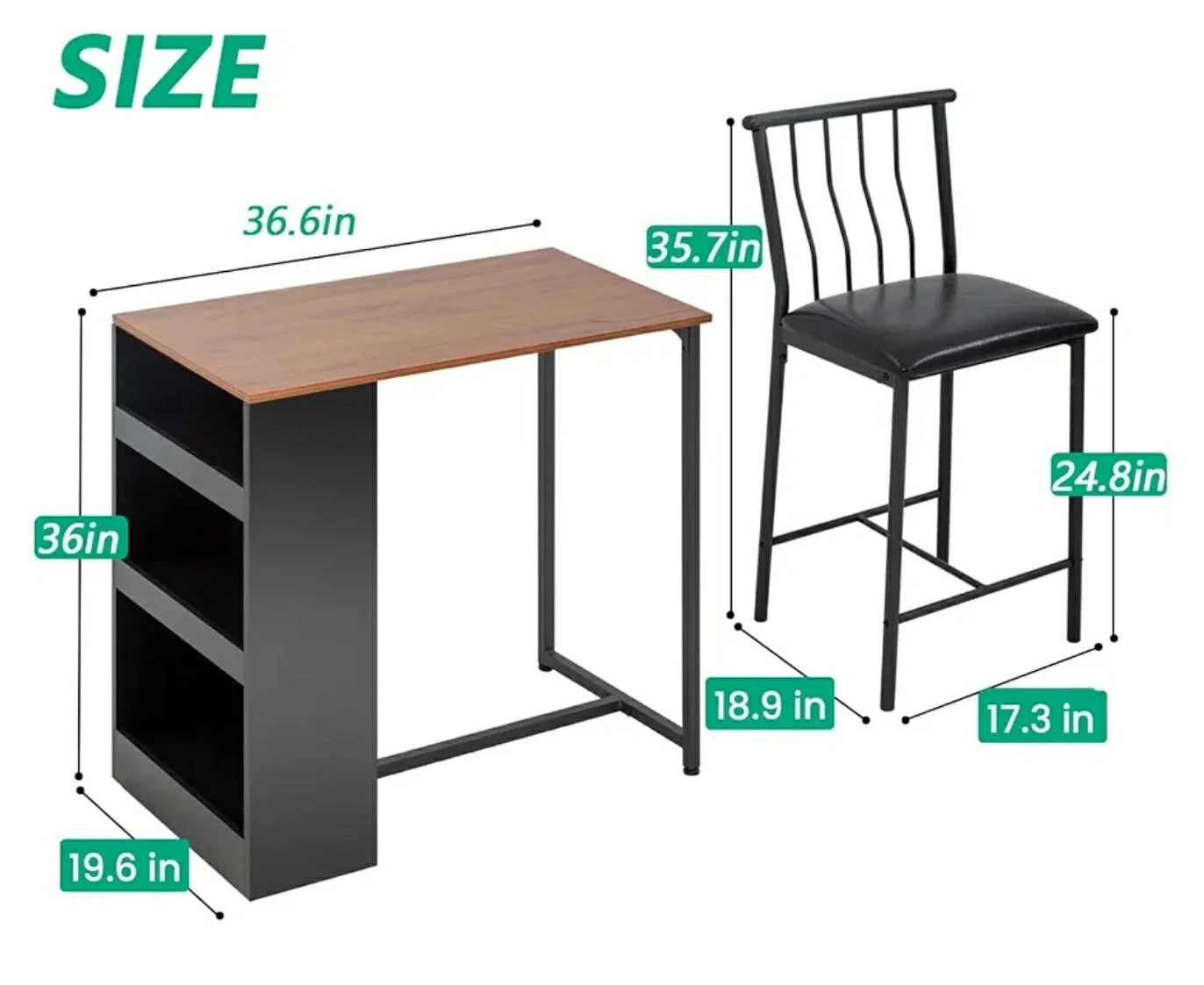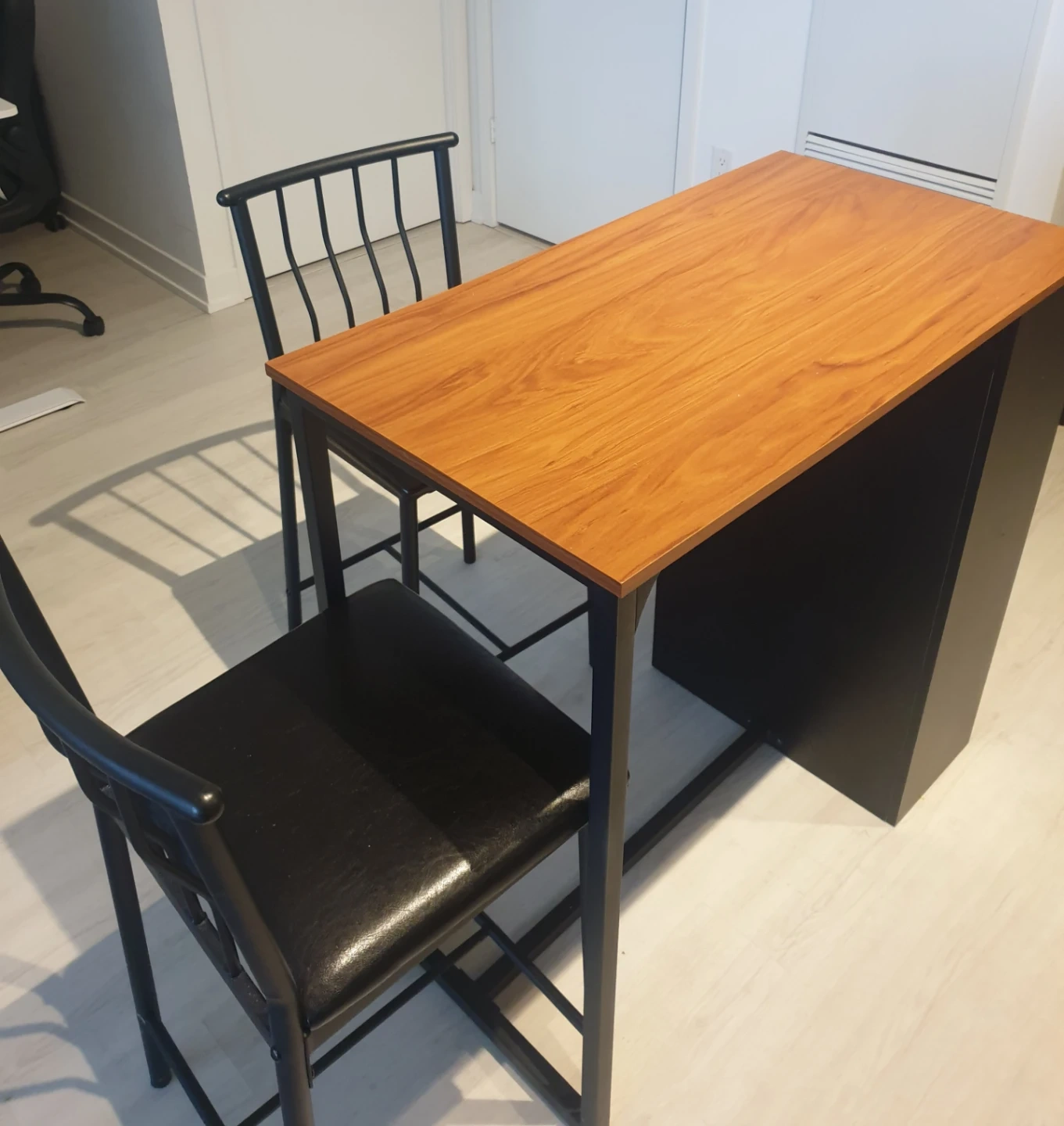 Compact kitchen table set. Light wood top. Black metal frame with chairs. Black storage shelves. Perfect for small spaces. I'm open to negotiations.