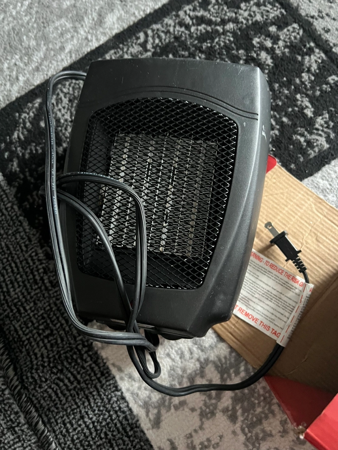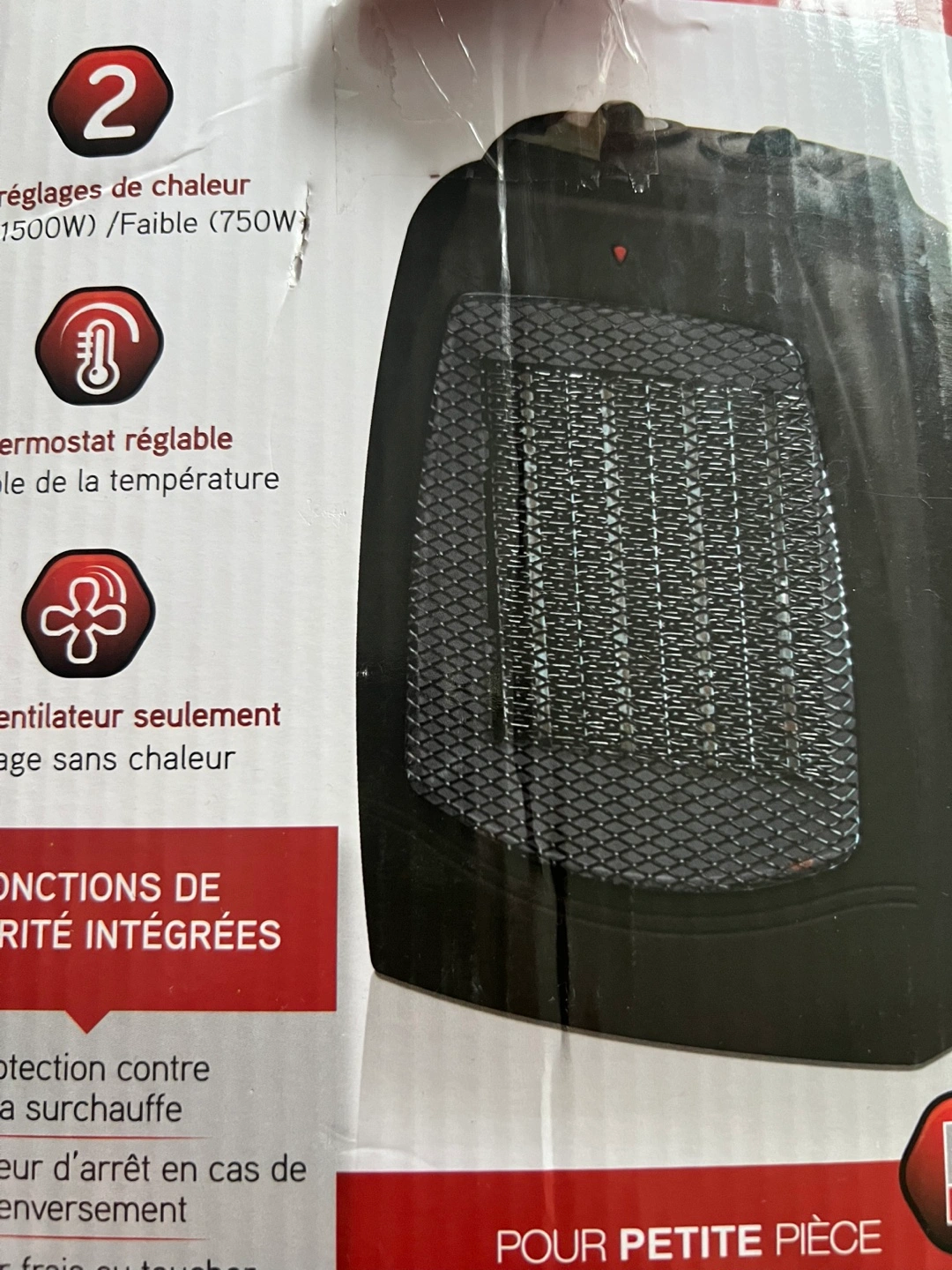 Portable electric heater. Two heat settings: 750W and 1500W. Adjustable thermostat. Overheat protection. Fan-only setting. Ideal for small spaces.
