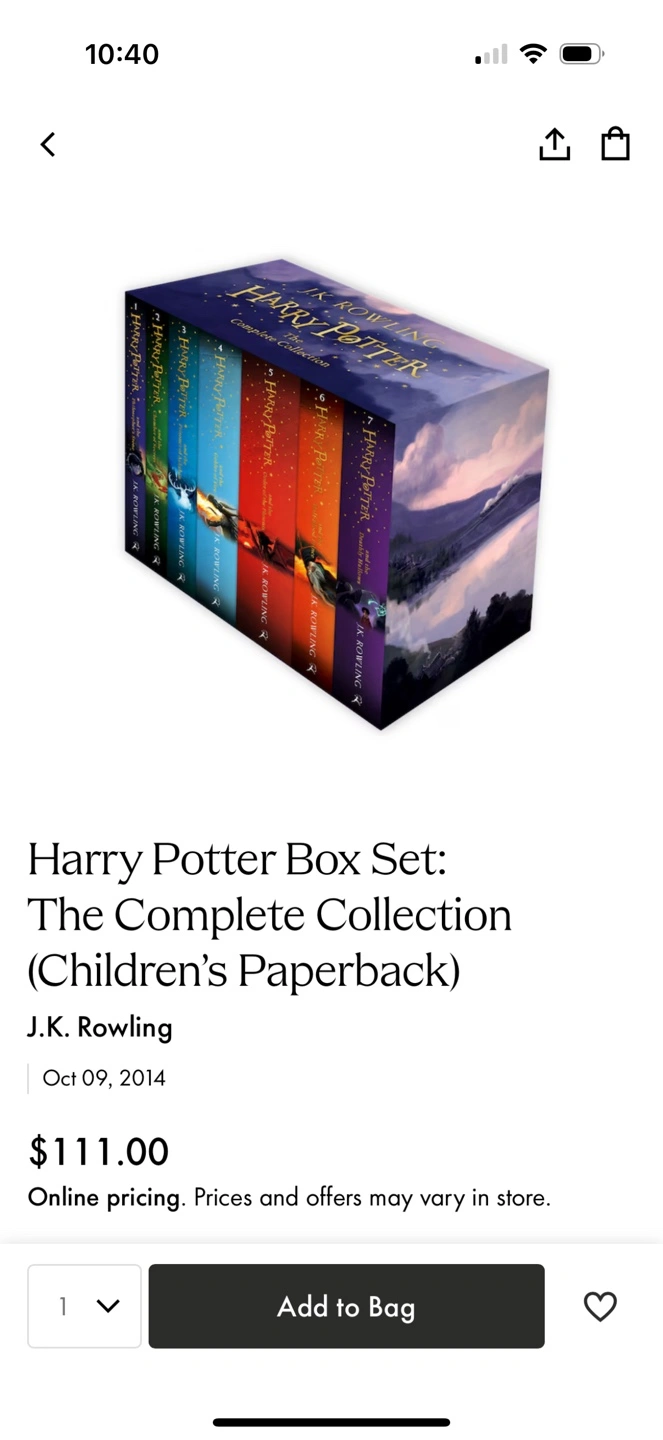 34Collection of seven Harry Potter books. Includes all seven novels in the series. Condition is new, only read once. Price is negotiable. Original Price: $111 (Indigo)