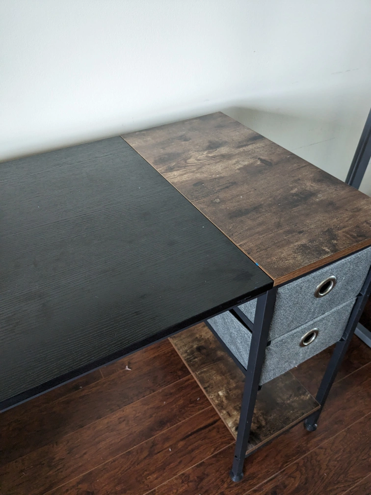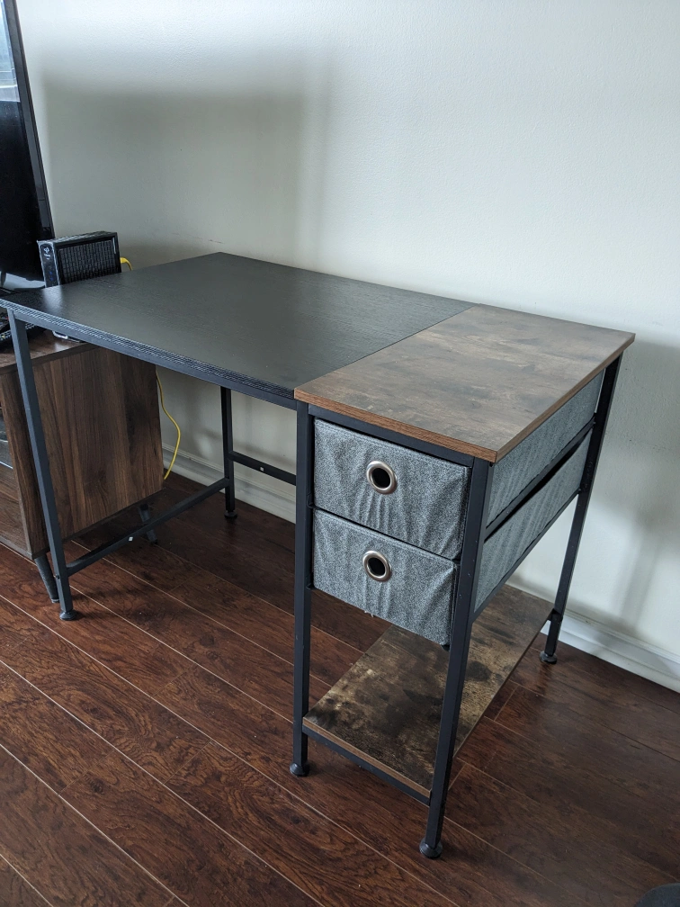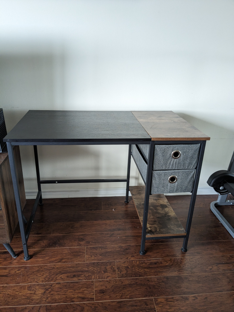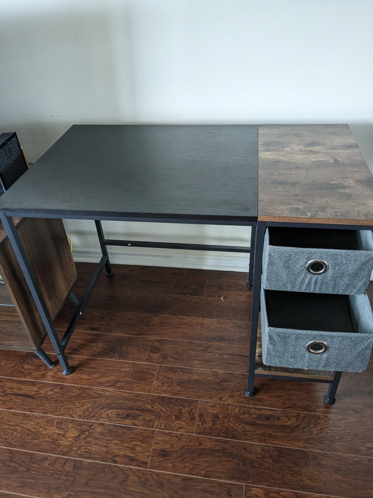 90Computer desk / Reading table with 1 shelf and 2 fabric drawers is now available at a very reasonable price. Black + walnut top and black metal legs. L/W/H= 40/24/30 inch. Pay at the pick up site. Please pay in cash or e-transfer only.