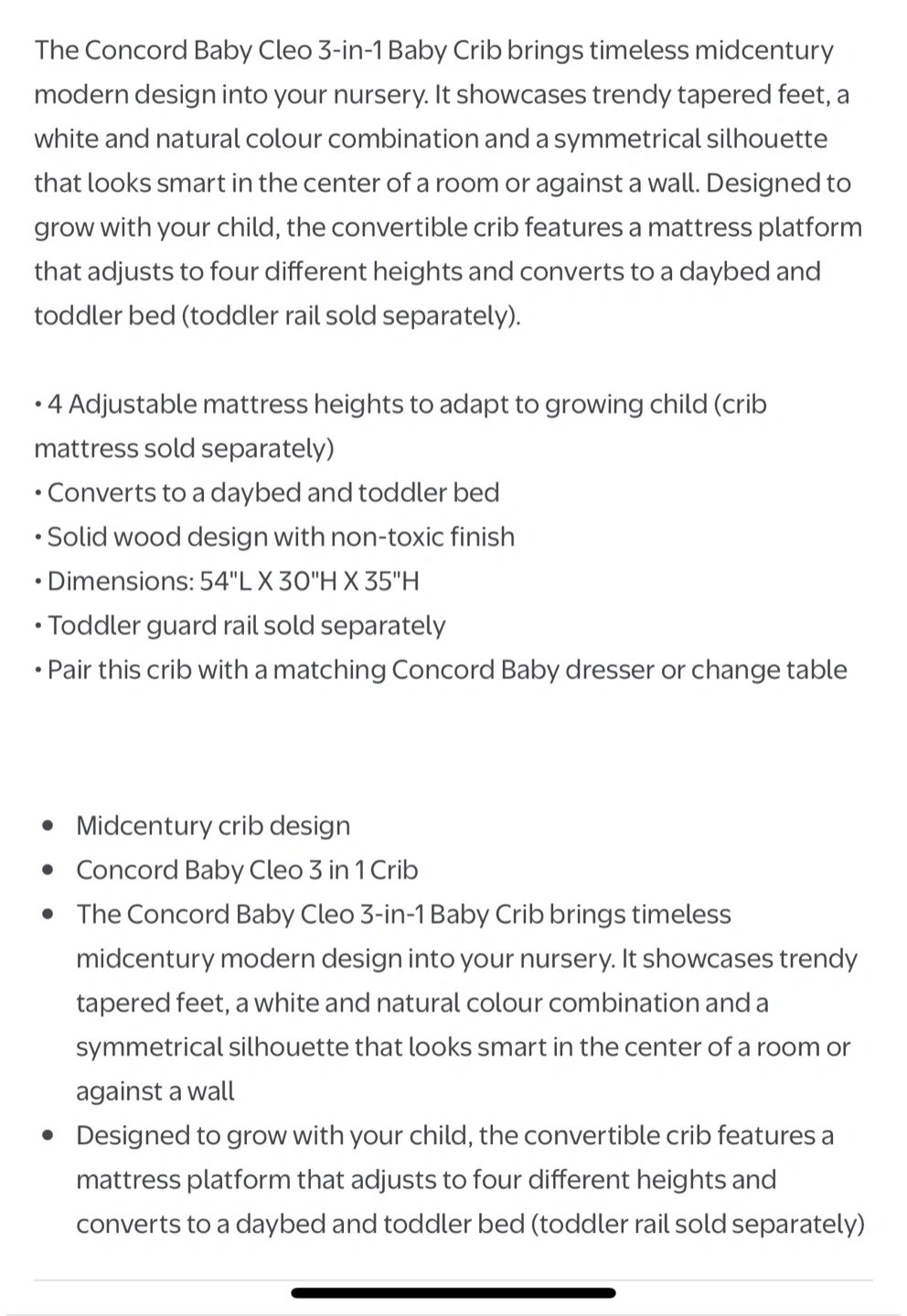 60Selling a Concord Baby Cleo 3-in-1 crib. It brings a timeless midcentury modern design into your nursery. It showcases trendy tapered feet, a white and natural colour combination and a symmetrical silhouette that looks smart in the centre of a room or against a wall. - Converts to a daybed and toddler bed - Solid wood design with non-toxic finish - Dimensions: 54"L x 30"H x 35"H Originally bought for $199.97+tax*