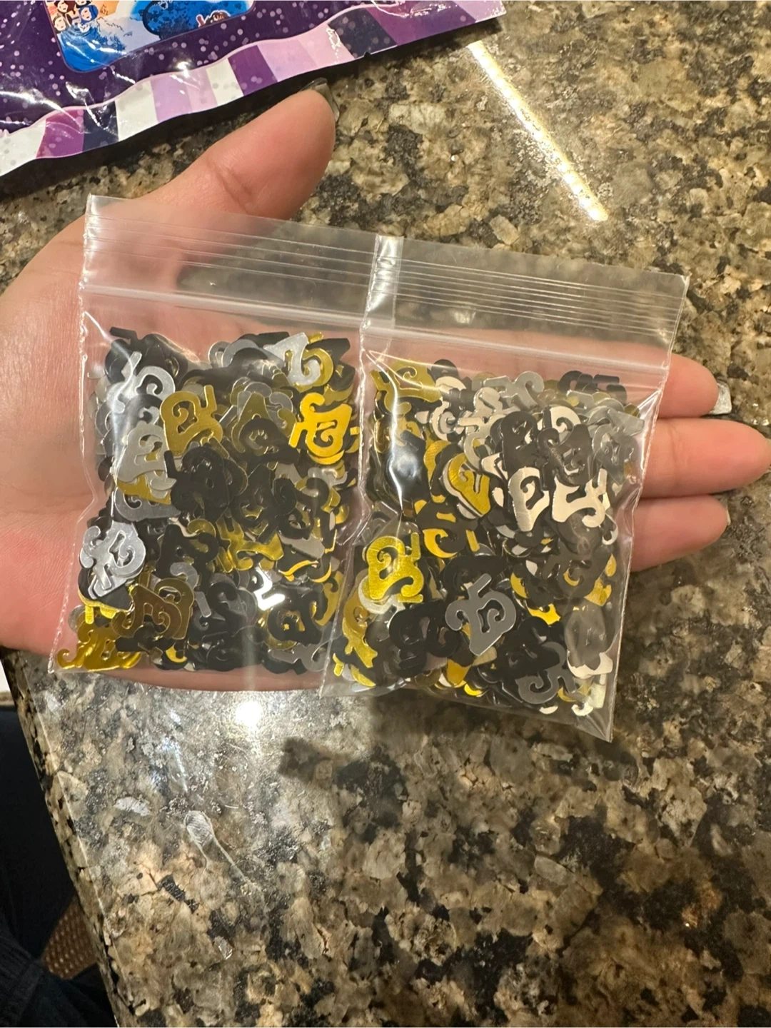 106Two small bags of confetti in black, gold, and silver colours! Perfect for parties or celebrations.