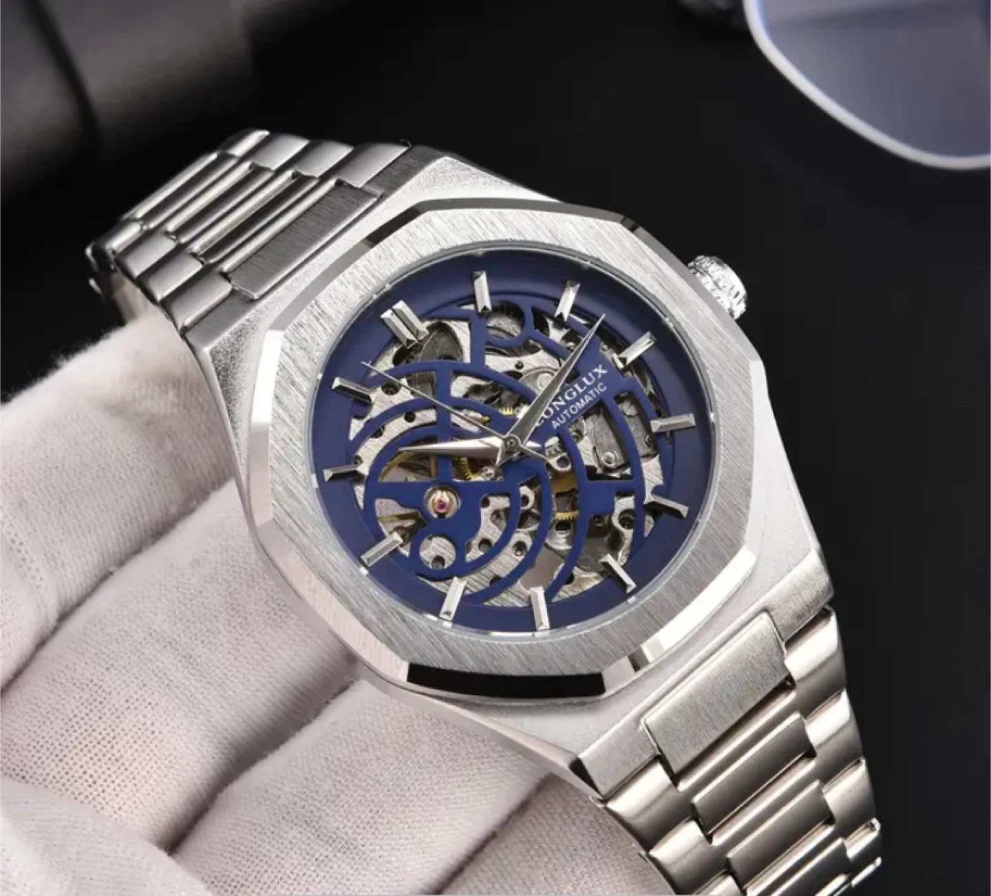 Selling a ConglUX automatic watch with a cool skeleton design and a blue face. It's in great shape and ready for a new wrist!