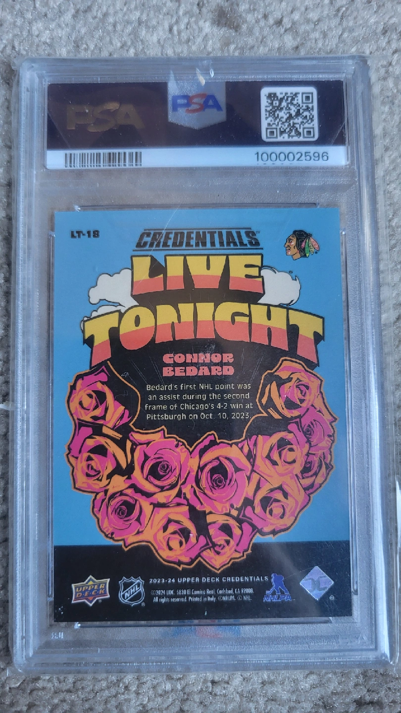 57Selling a Connor Bedard Credentials Live Tonight hockey card. It's in mint condition and graded a 9 by PSA. This card is from the 2023-24 Upper Deck Credentials series. A great addition to any hockey card collection!