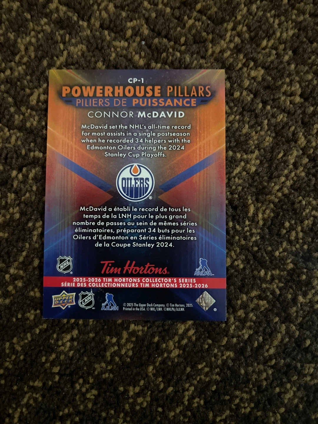 60Selling a Connor McDavid hockey card from the 2025-2026 Tim Hortons Collector's Series. It's part of the Powerhouse Pillars collection and features McDavid in his Oilers jersey. A great addition for any hockey fan or card collector!