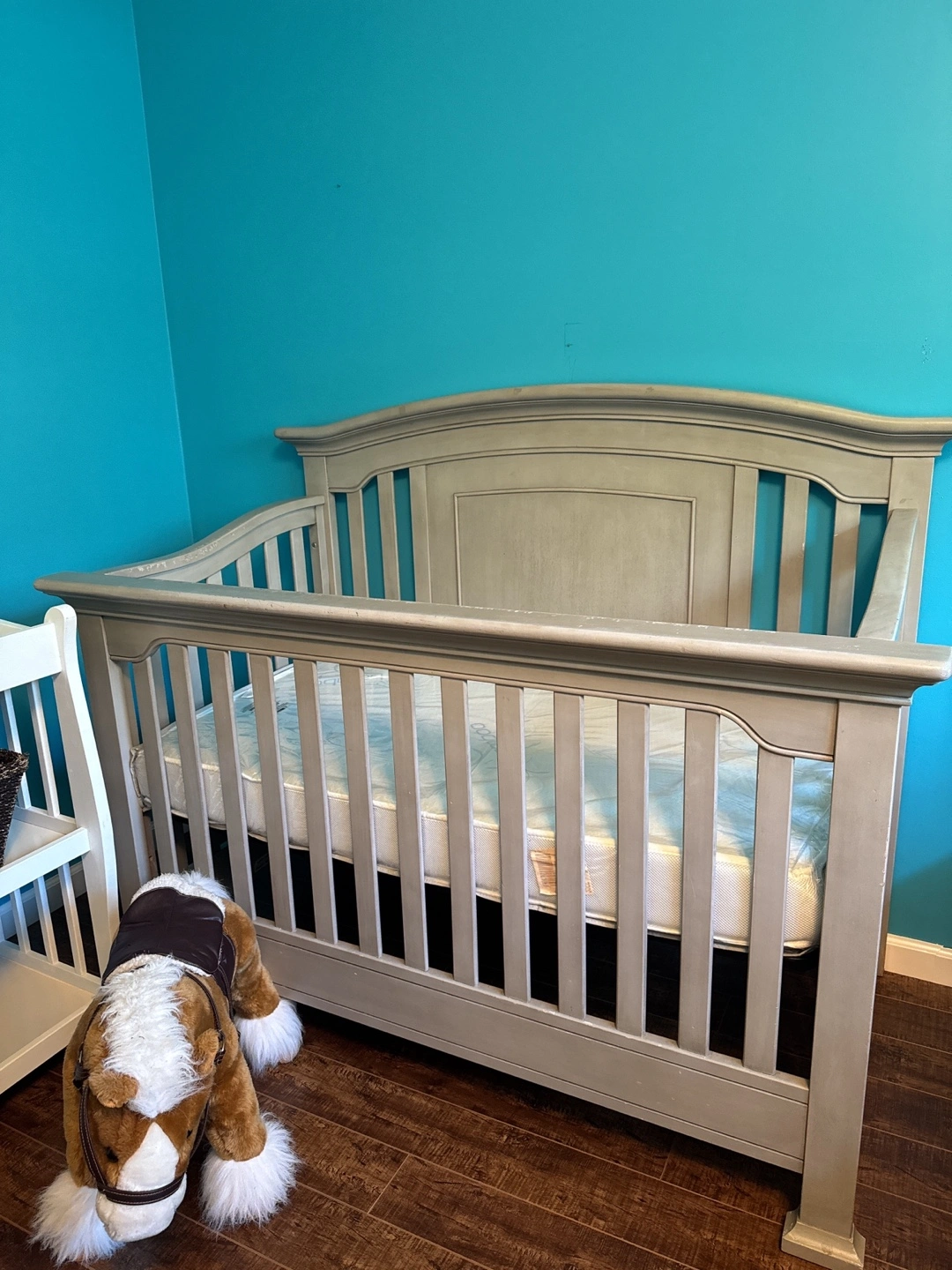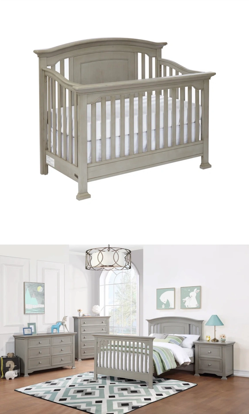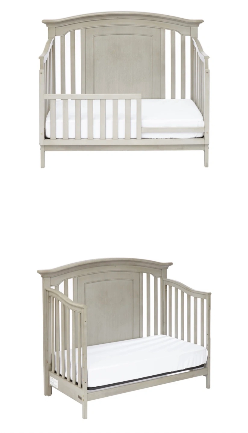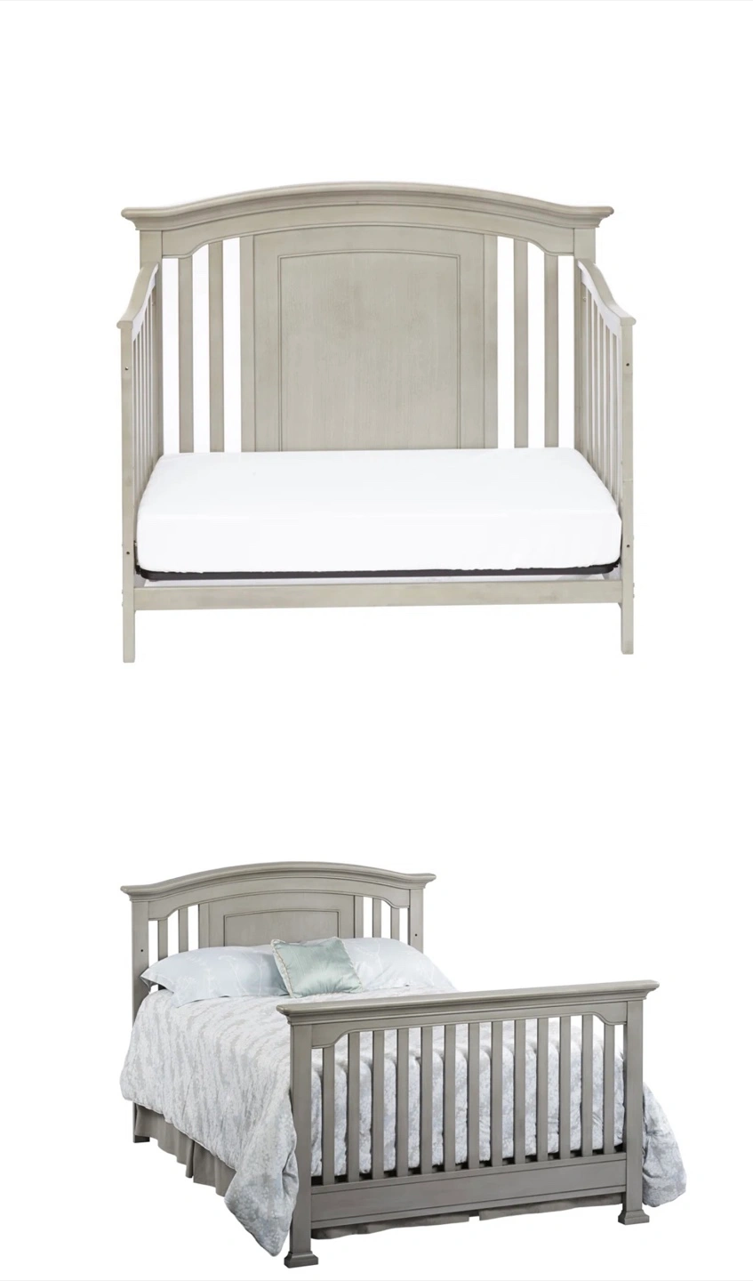 66Solid Wood – Heavy and sturdy! Converts from crib to Daybed, Toddler Bed, Twin/Full Bed, and Full Bed with Footboard — perfect from baby to teen! Includes a white changing table with two baskets and a bouncy feature Baby Jumperoo** with lights, sounds, and jumping jungle fun (used for just 7 months!) Details: Crib originally purchased for $1,209 + tax Changing table: $190 Baby Jumperoo: $70 (approximate retail value)