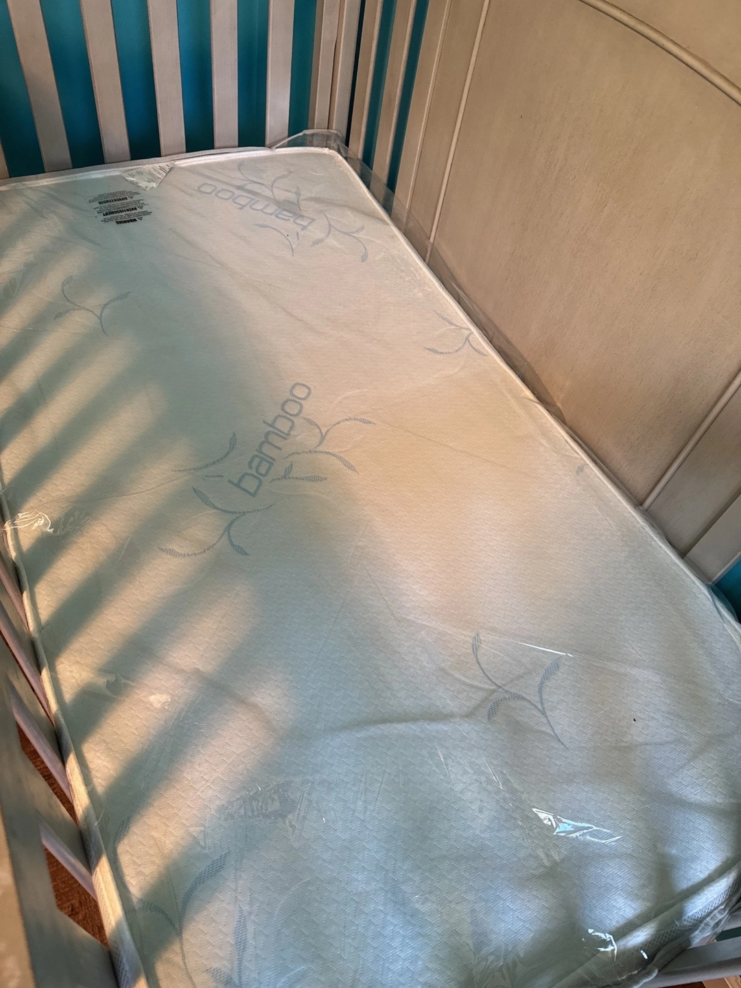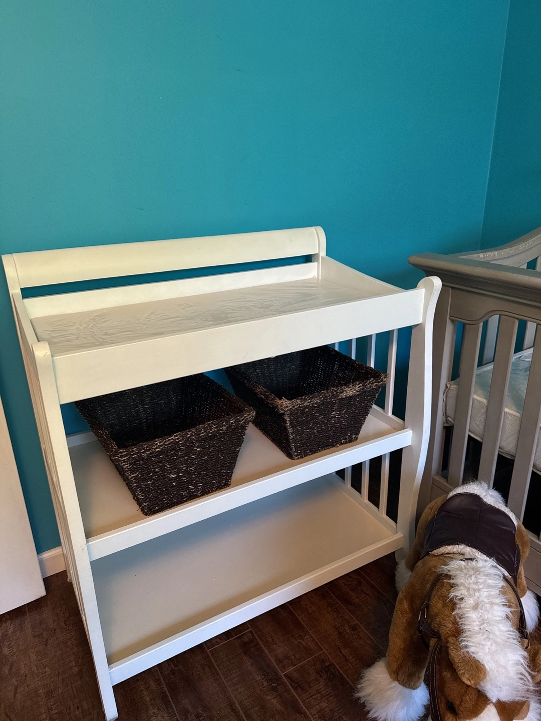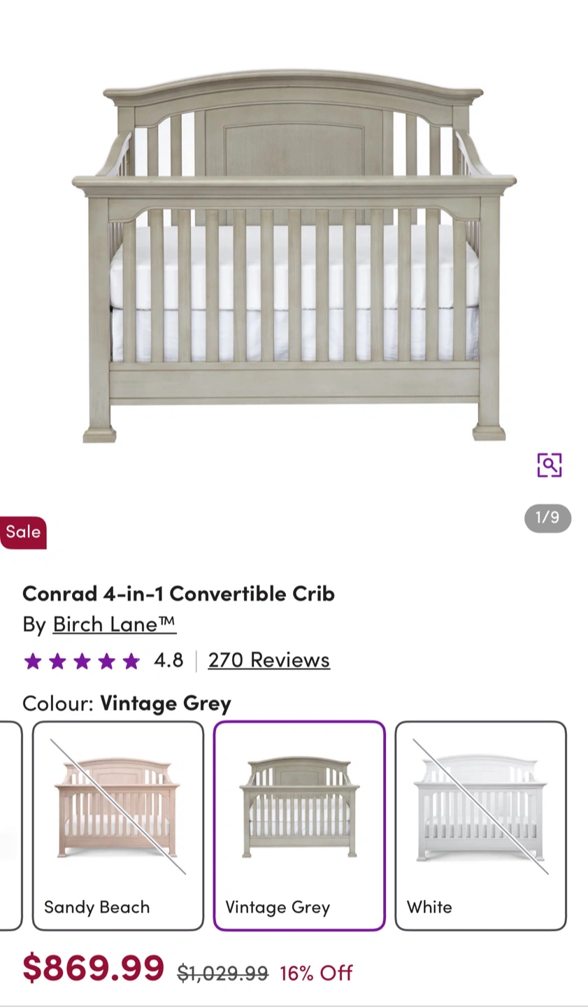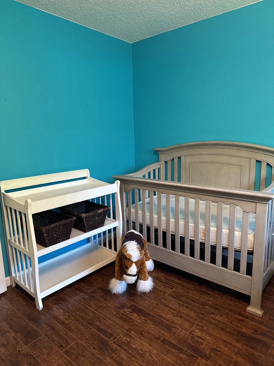 66Solid Wood – Heavy and sturdy! Converts from crib to Daybed, Toddler Bed, Twin/Full Bed, and Full Bed with Footboard — perfect from baby to teen! Includes a white changing table with two baskets and a bouncy feature Baby Jumperoo** with lights, sounds, and jumping jungle fun (used for just 7 months!) Details: Crib originally purchased for $1,209 + tax Changing table: $190 Baby Jumperoo: $70 (approximate retail value)