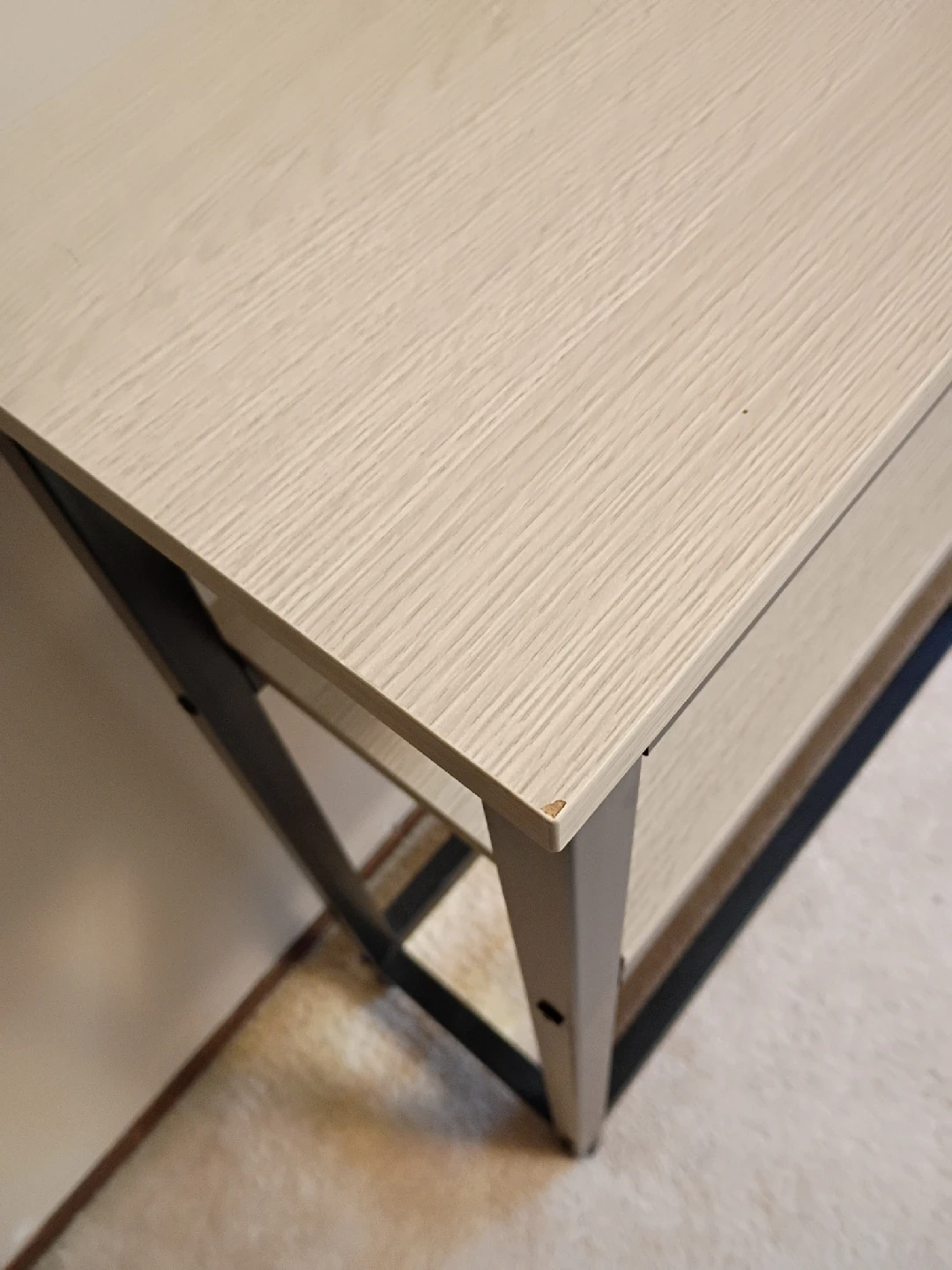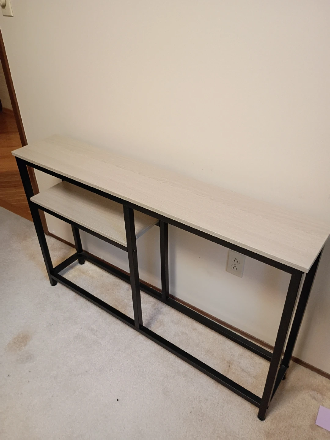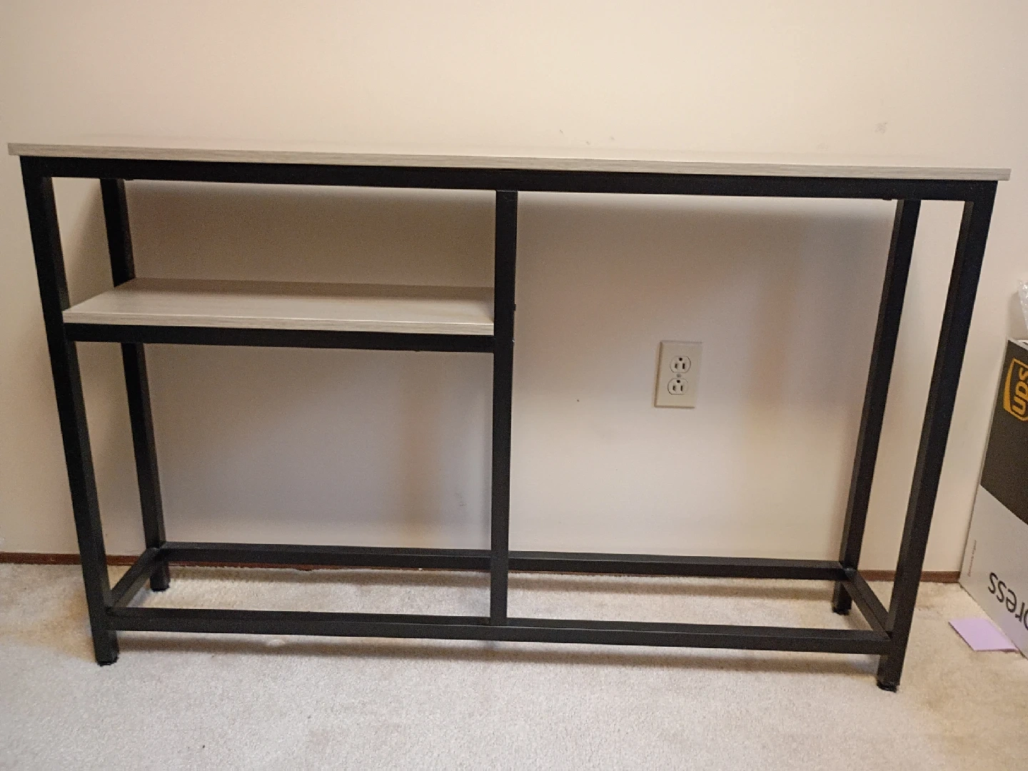 5Grey and black console table, pick up only. Has a small ding in one corner (pictured) but otherwise in good condition. 9in wide, 47.3in long, 29.5in high. Small shelf is 21.7inch long.