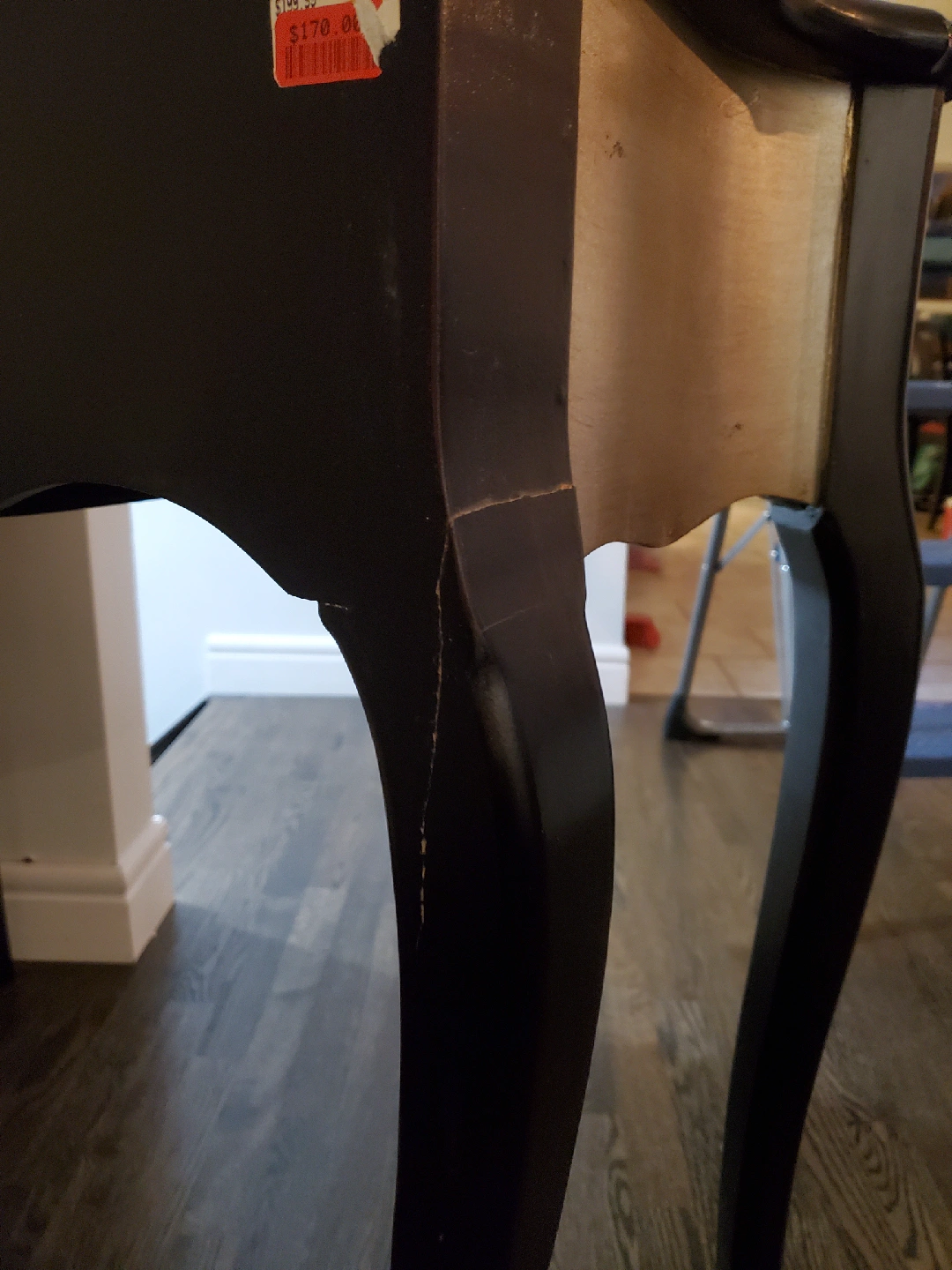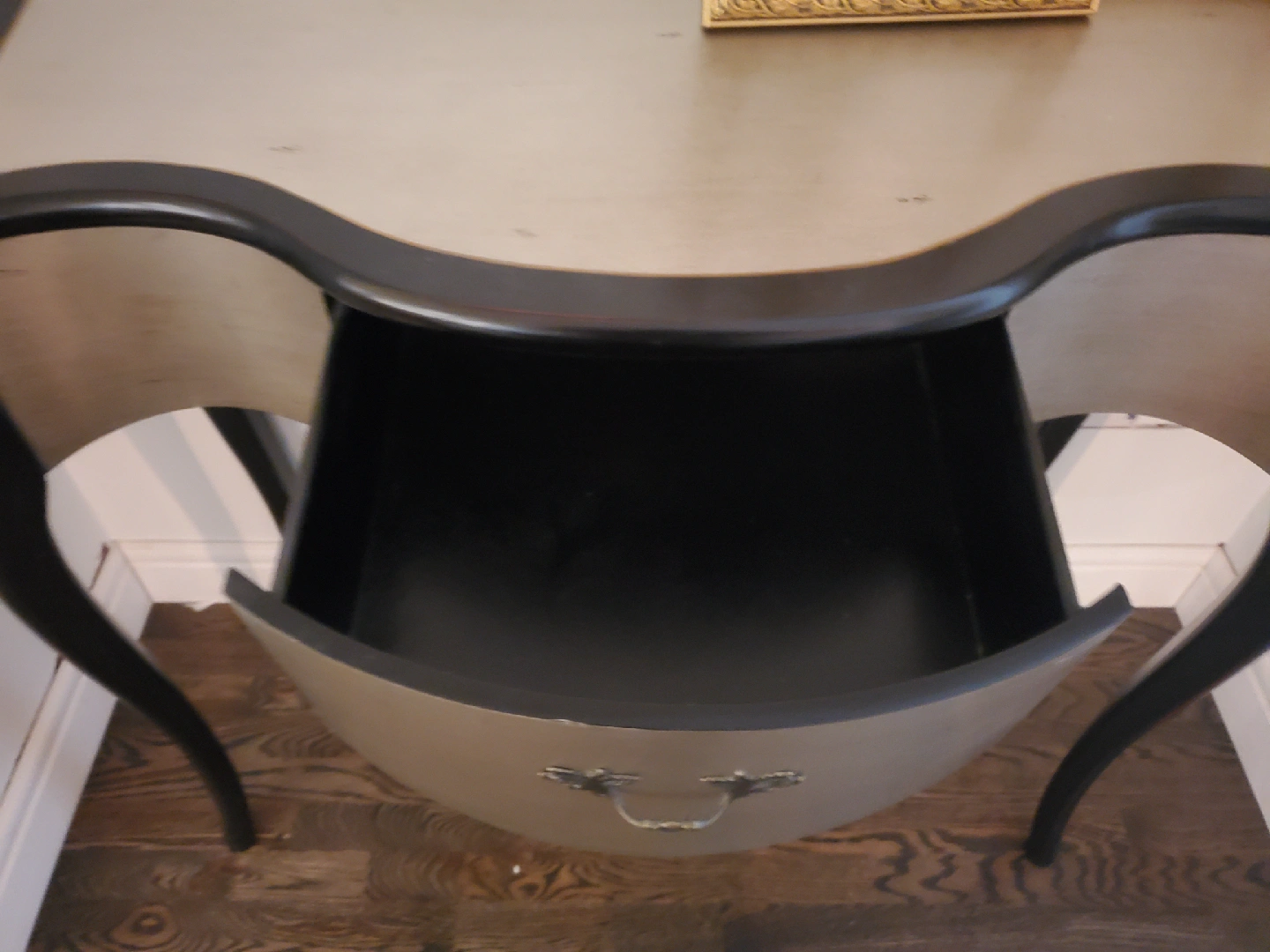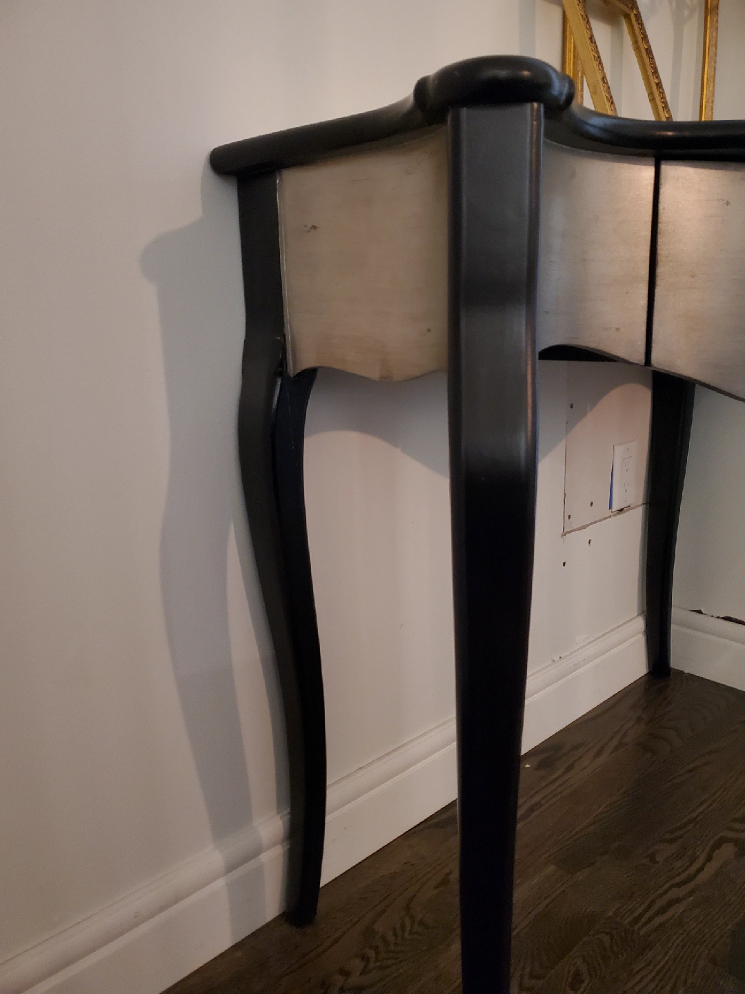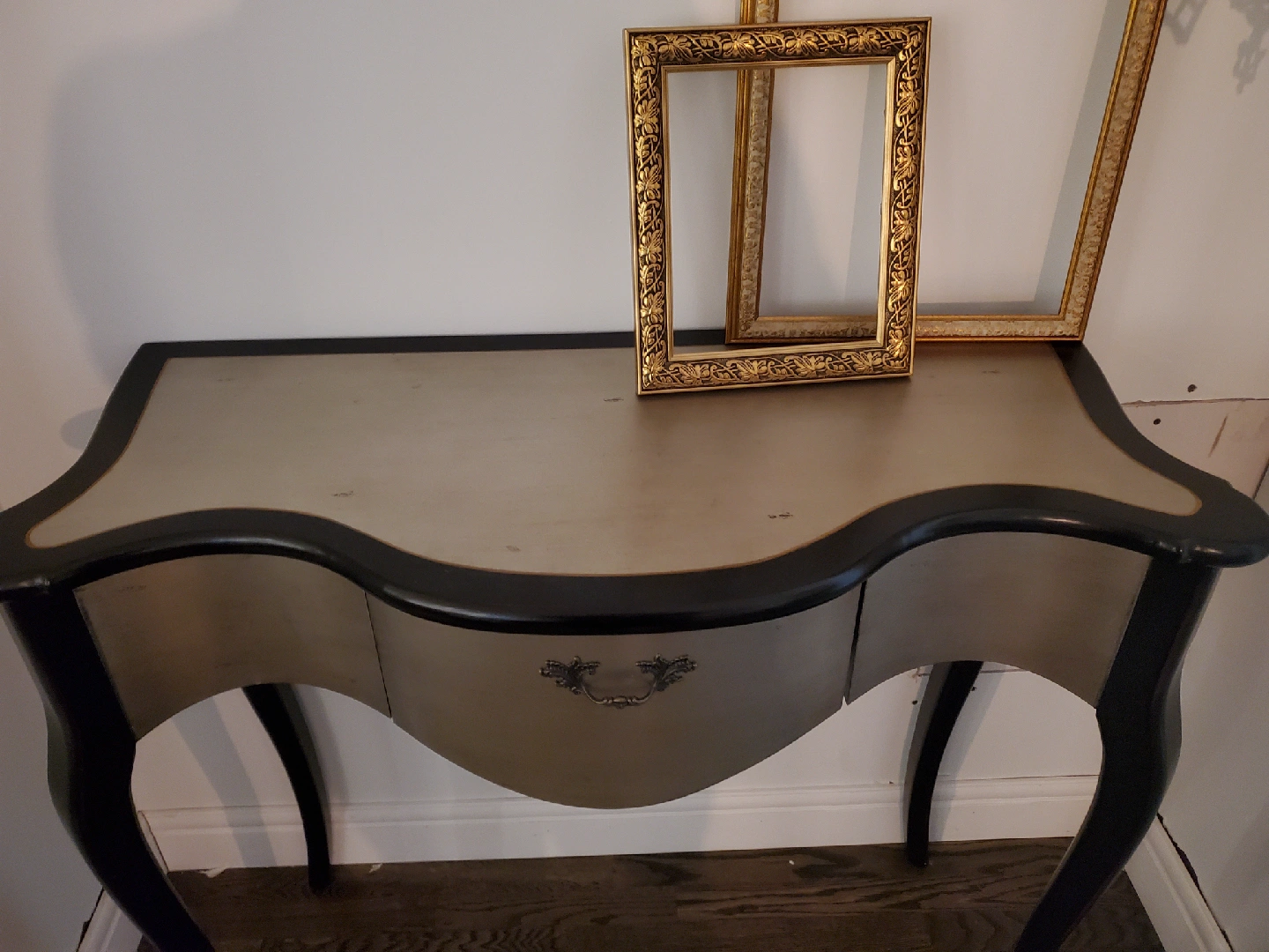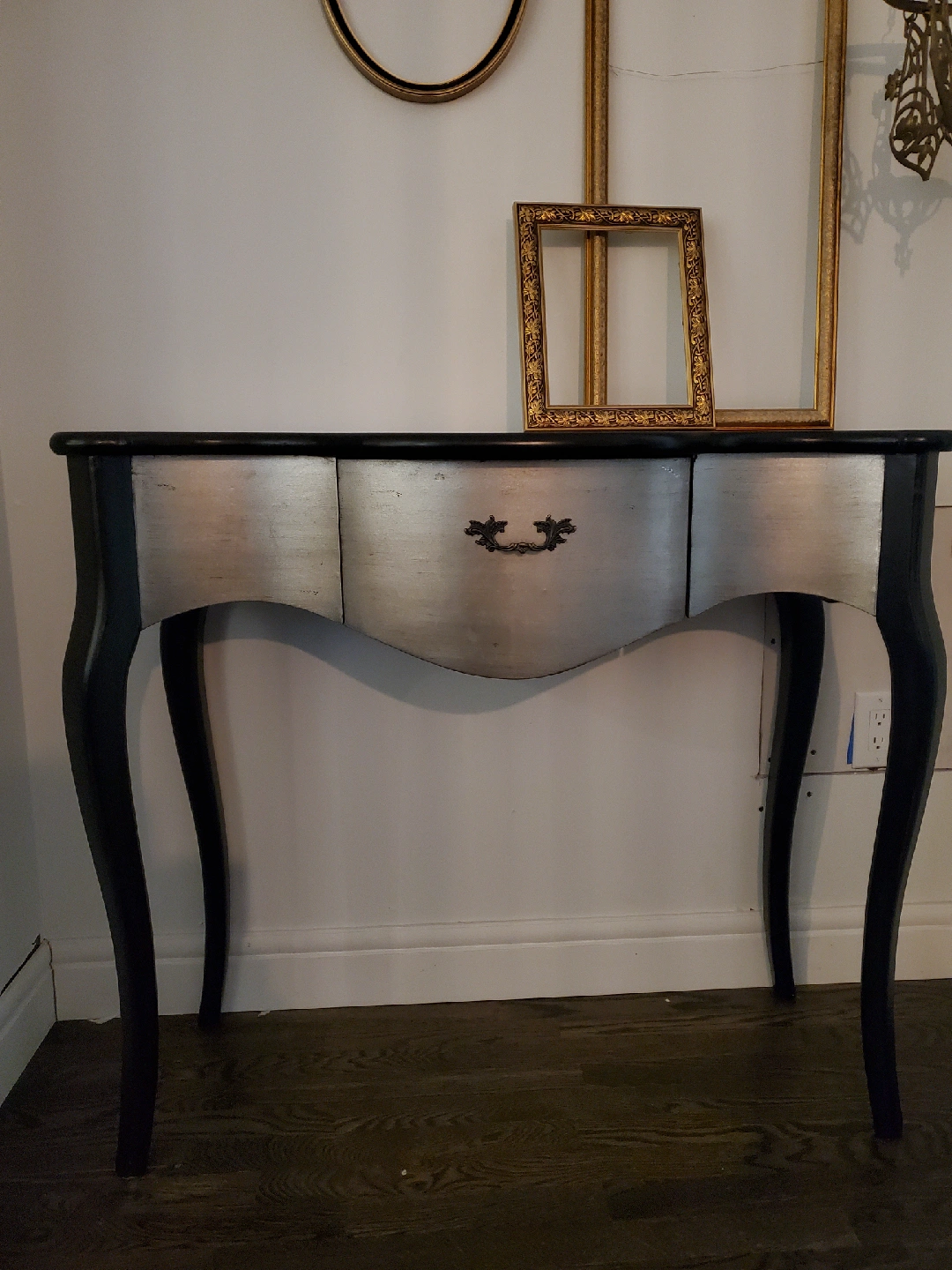 Black & Silver, Vintage inspired console table with a 14" W 13" D drawer. A crack in one back leg since bought new but does not compromise stability or structure.